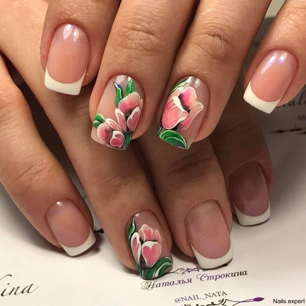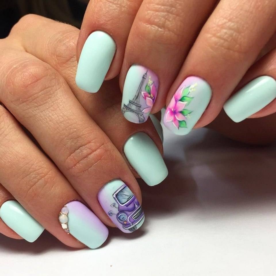 Les dessins floraux ne perdront pas leur pertinence. La nouveauté de la saison peut être appelée fleurs peintes avec un vernis mat sur une base brillante. Les marguerites, les marguerites, les roses, les bleuets et les pissenlits seront populaires. Pour une occasion spéciale, une manucure peut être décorée de strass ou de tout autre décor brillant.