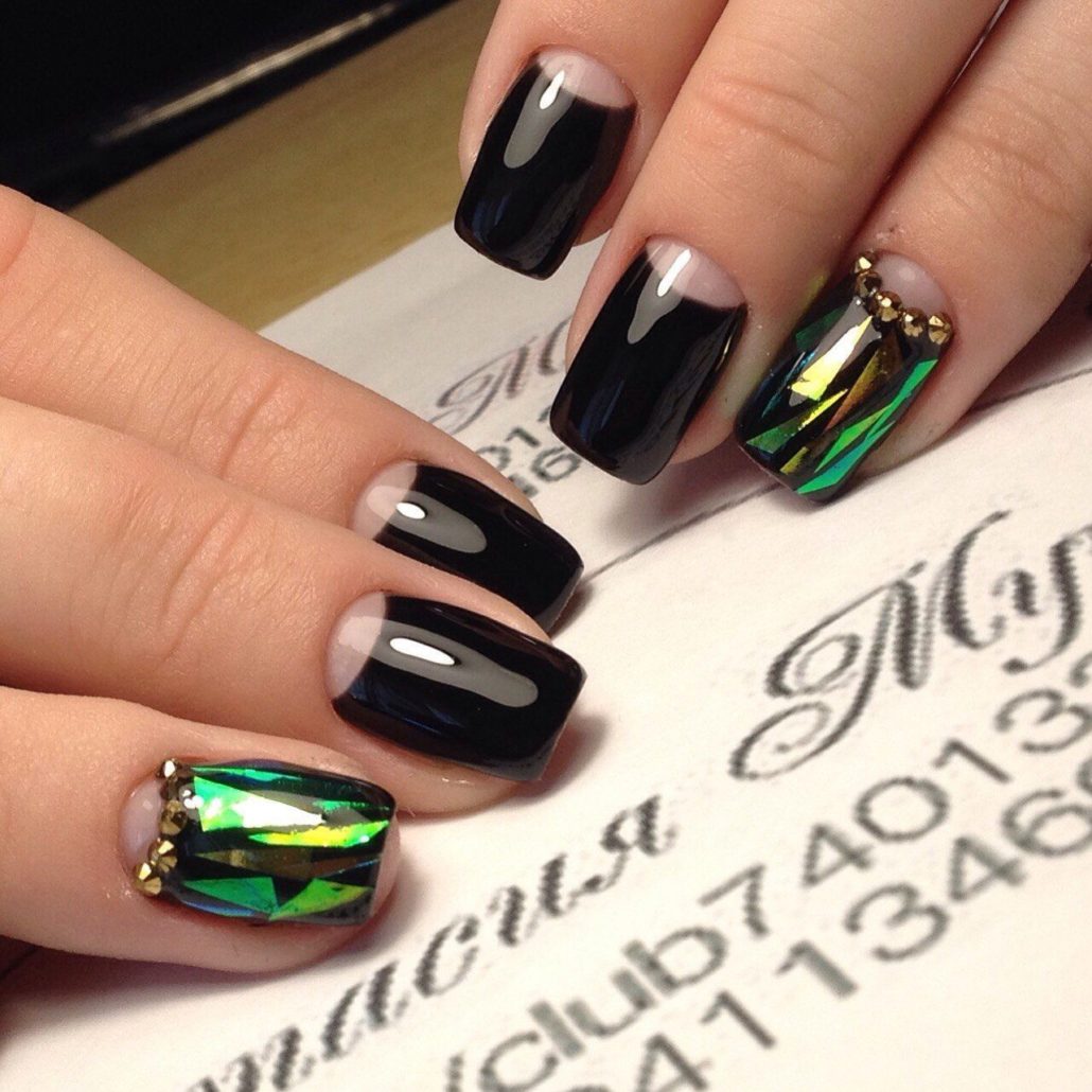 La feuille peut être utilisée dans le ton du revêtement principal ou dans une teinte contrastante. Dans la manucure de vacances, vous pouvez utiliser une feuille de n'importe quelle couleur appliquée sur un revêtement noir.Pour les adeptes du style professionnel, des pièces pastel, crème ou argentées sur fond transparent ou neutre conviendront.