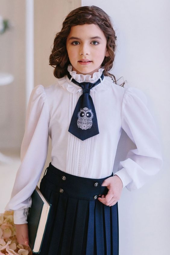Si vous le souhaitez, vous pouvez compléter l’uniforme scolaire avec des accessoires. Il peut s'agir d'une petite cravate ou d'un noeud papillon associé à un costume de pantalon. C'est très attrayant.