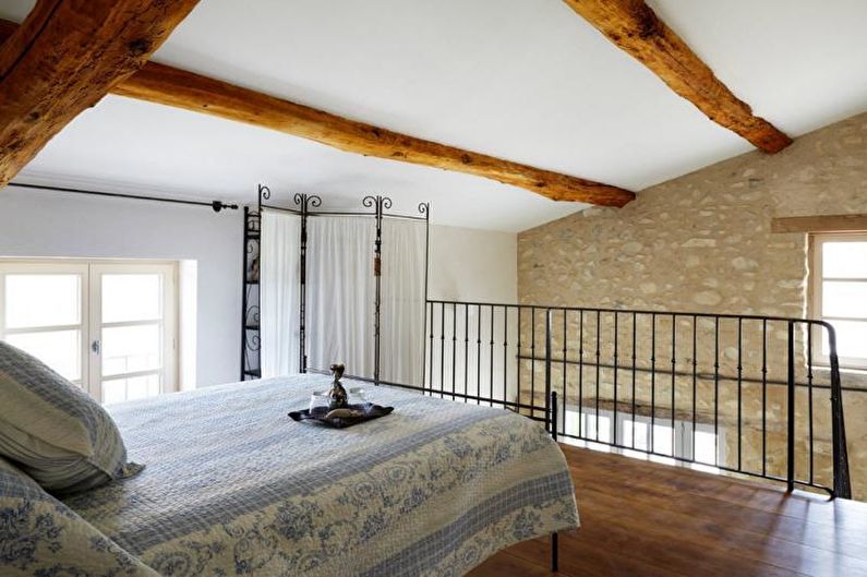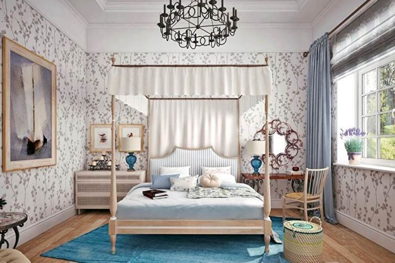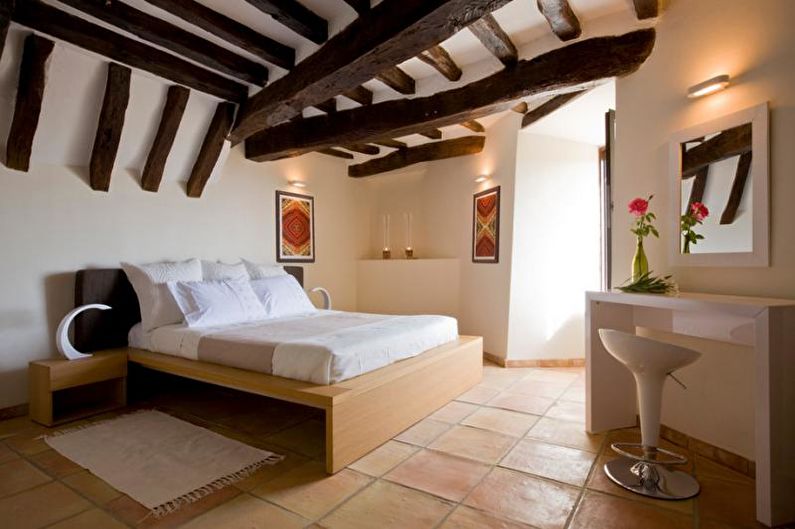 Le laconicisme est la base du style méditerranéen. Le mobilier fonctionnel (buffets, tables de chevet, lit) associé à des tables décoratives, des fauteuils, des commodes est une chambre à coucher typiquement grecque. La monotonie de la pièce est diluée avec des tapis multicolores, des tapis, un décor original de couleurs inhabituelles.
