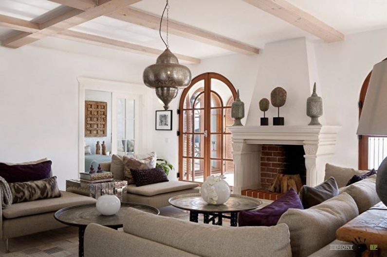Les résidents des pays méditerranéens apprécient les rassemblements conviviaux et familiaux lors d'un repas. C'est tout un rituel. Le salon doit avoir une table en métal, en osier ou en bois. Le décor sera constitué d'accessoires en bois, de lampes en fer forgé, d'amphores et de pots en céramique. À l'aide de tapis colorés, de coussins de canapé, une finition légère est diluée.