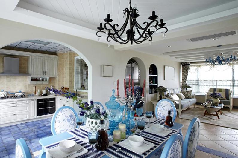 Une ambiance méditerranéenne aidera à incarner une approche individuelle et de l’imagination.Le décor utilise des peintures de paysages (côte, océan, mer), des accessoires faits à la main, des vases en verre, des cadres colorés avec des reflets bleus, des fleurs fraîches, un panneau de coquillages, des pierres de mer de formes variées. Il devrait y avoir beaucoup de lumière - lampes et lampes de sol, spots, appliques murales, lustres soignés.
