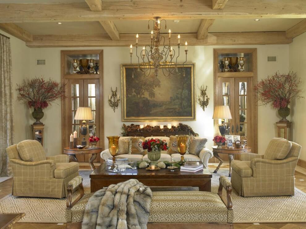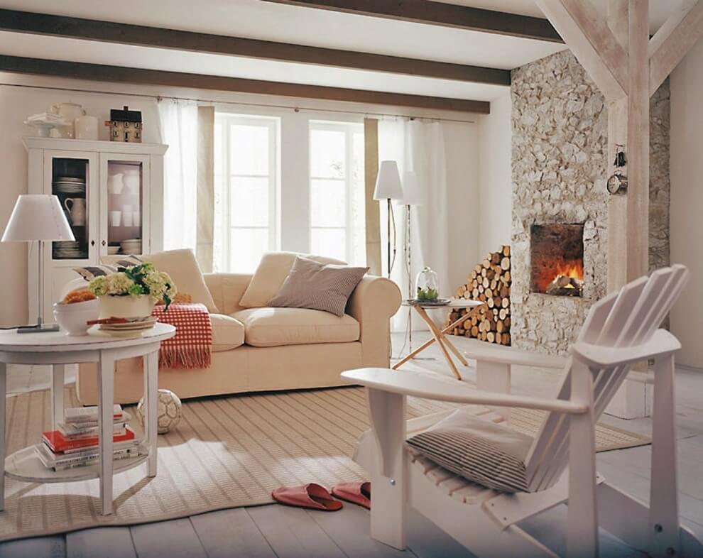 Décorant un plafond de style campagnard, la préférence est donnée aux poutres en bois qui ont un aspect spectaculaire contre les murs clairs et qui peuvent devenir un élément important de la maison.
