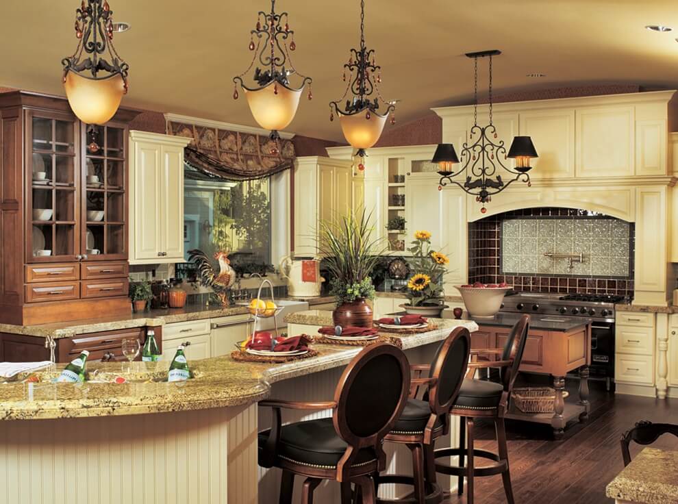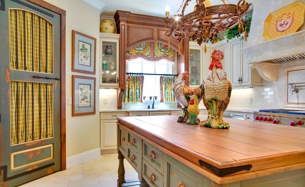 La cuisine de ce style doit être simple et avoir l’air le plus naturel possible. Vous pouvez accrocher des rideaux de coton décorés de rubans aux fenêtres. La table doit être recouverte d'une nappe brodée à la main. Les chaises doivent avoir des sièges moelleux. Et pour l’éclairage, il est idéal d’utiliser un lustre à base forgée. Pour la décoration, utilisez des peintures représentant une nature morte, des vases en argile et des plaques en céramique.