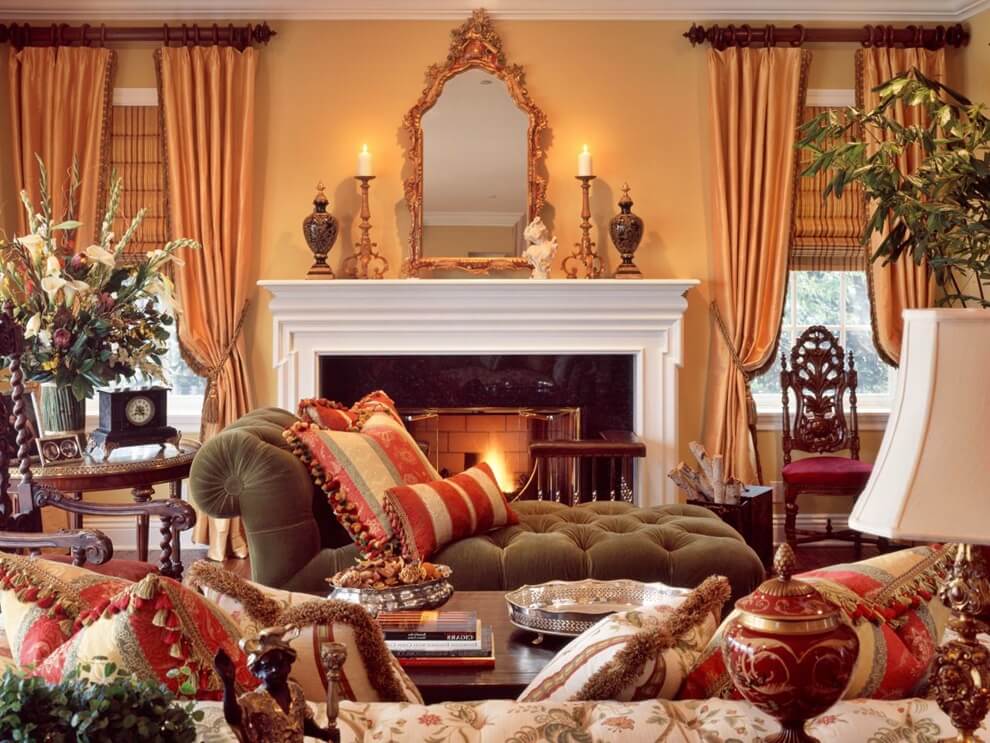 Pour le zonage de la pièce, des chaises ou des casiers sont utilisés. Vous pouvez décorer le salon avec des chandeliers en fer forgé, des pots de fleurs élégants ou des personnages en argile ou en bronze. En outre, utilisez des peintures, des tapis avec un motif, des photographies ou des accessoires que vous avez créés.