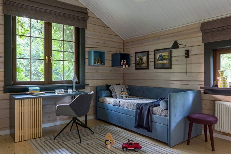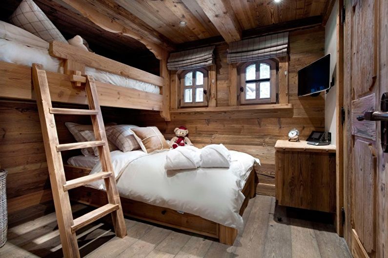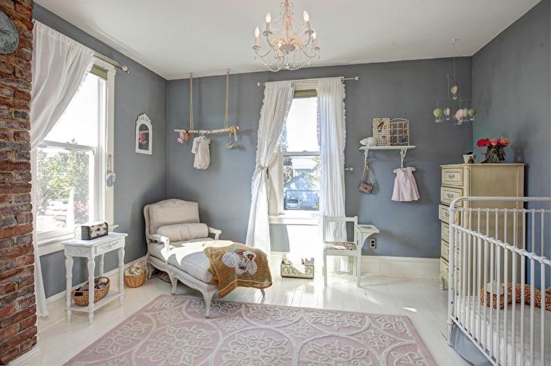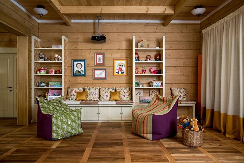 Des nuances chaudes, des meubles en matériaux naturels, des étagères et d'autres éléments caractéristiques du style campagnard seront parfaits pour la décoration d'une chambre d'enfant. Des figurines en argile, des jouets feutrés, des coffres en bois vintage où vous pouvez ranger des objets et des jouets, de beaux dessins pour enfants et des miroirs anciens contribueront à la décoration de la pièce.