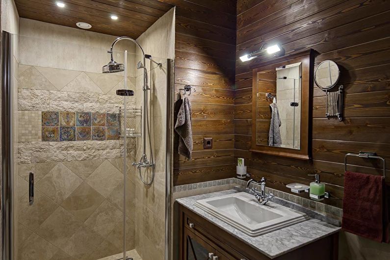 Les serviettes forgées et les meubles modulaires auront fière allure dans la salle de bain. Pour le revêtement du sol et des murs, on utilise des carreaux de pierre ou de couleur claire. Des miroirs vieillis, des porte-savons en argile, des tapis en matériaux naturels sont choisis comme décor.