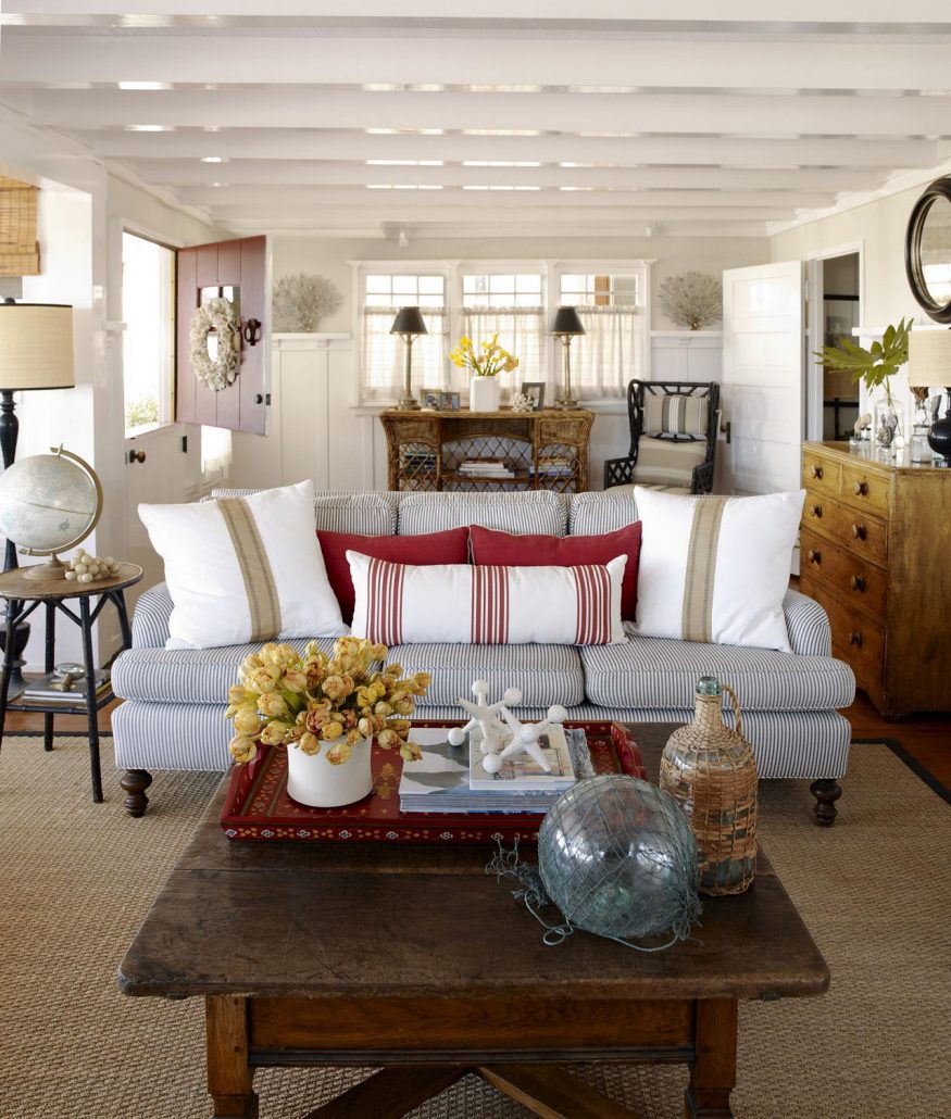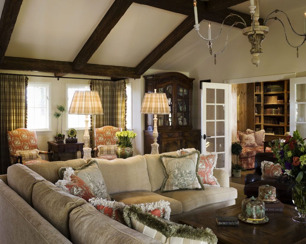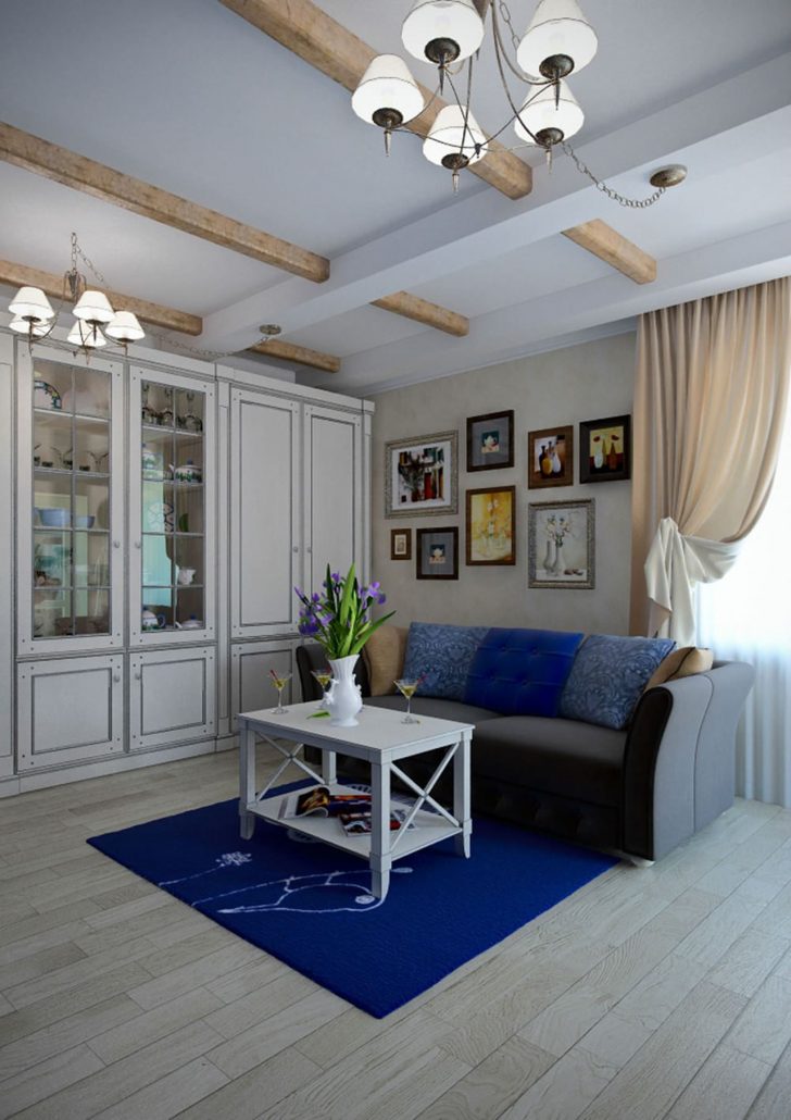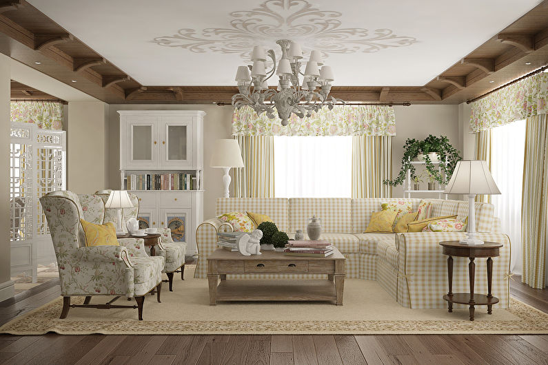 Le plafond de style provençal doit être parfaitement lisse et peint en blanc. Vous devez le décorer avec un lustre élégant. Le point culminant du style provençal peut être des poutres en bois sous le plafond.