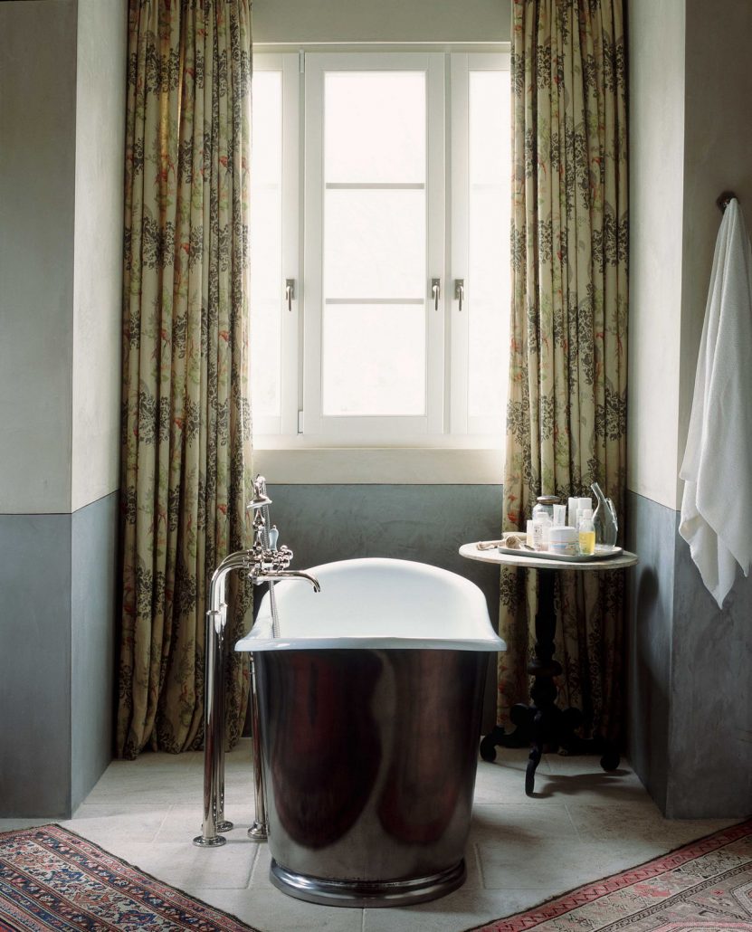 La principale chose dans cette pièce devrait être la salle de bain dans le style canonique. Mais la douche ici sera inappropriée. Les carreaux doivent choisir des tons pastel. Idéal si c'est mat. Seul le bas du mur peut en être fini, tandis que le haut est simplement peint à la peinture blanche ou décoré de plâtre.