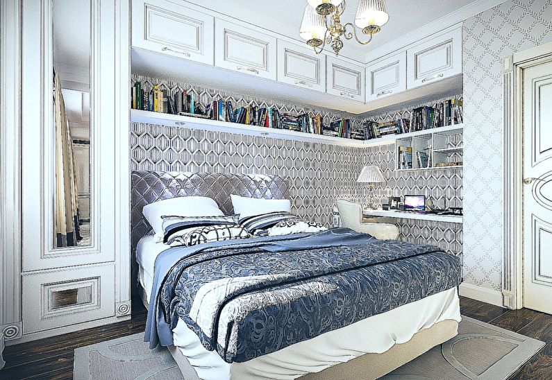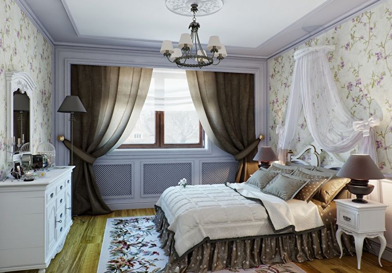 La commode et la coiffeuse s'intègreront parfaitement à l'intérieur de la chambre. Sur les fenêtres devraient être suspendus des rideaux d'air dans un style classique.