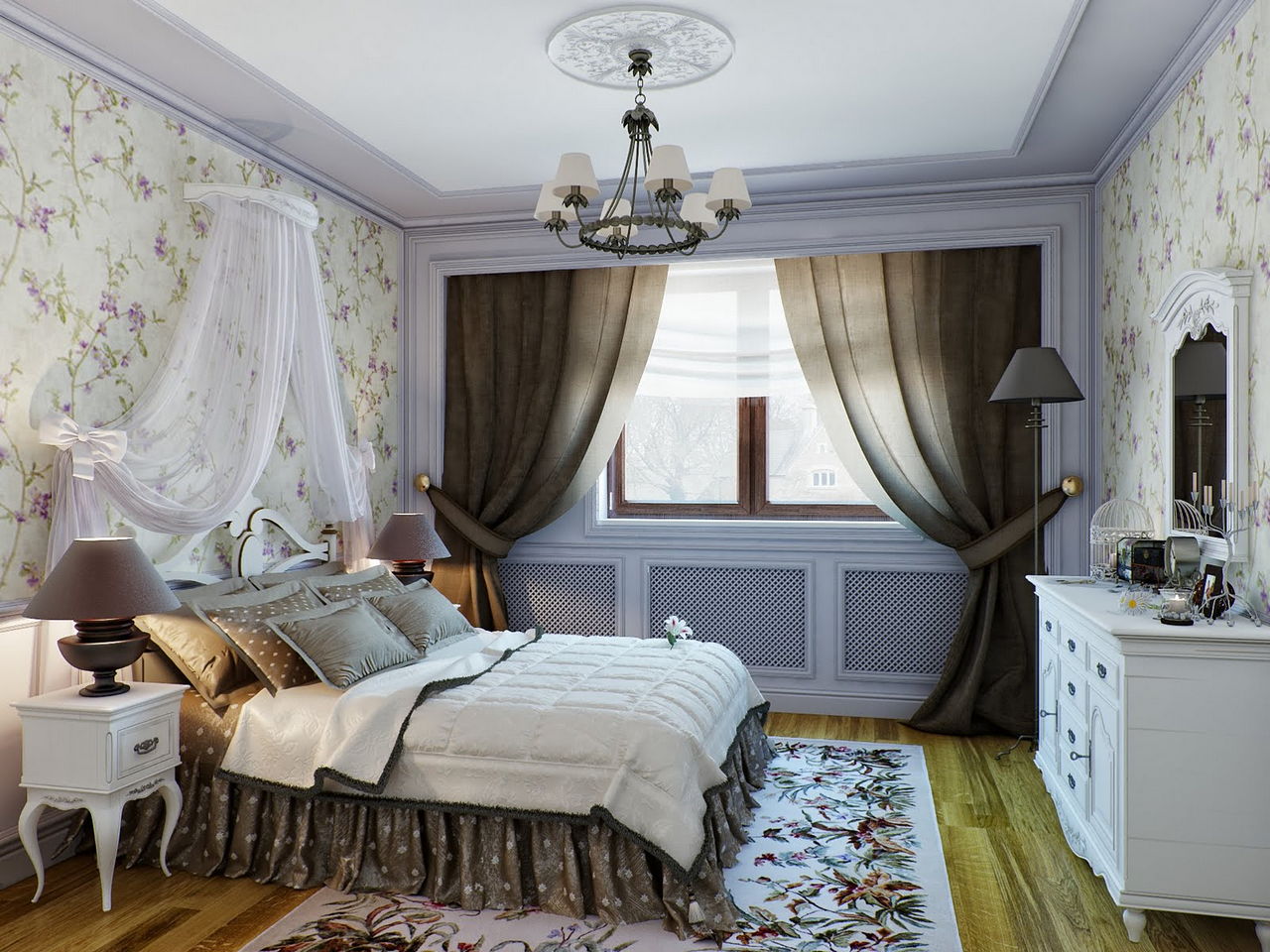 La commode et la coiffeuse s'intègreront parfaitement à l'intérieur de la chambre. Sur les fenêtres devraient être suspendus des rideaux d'air dans un style classique.