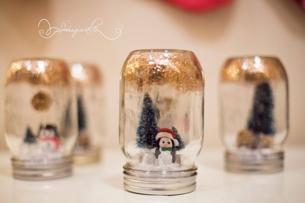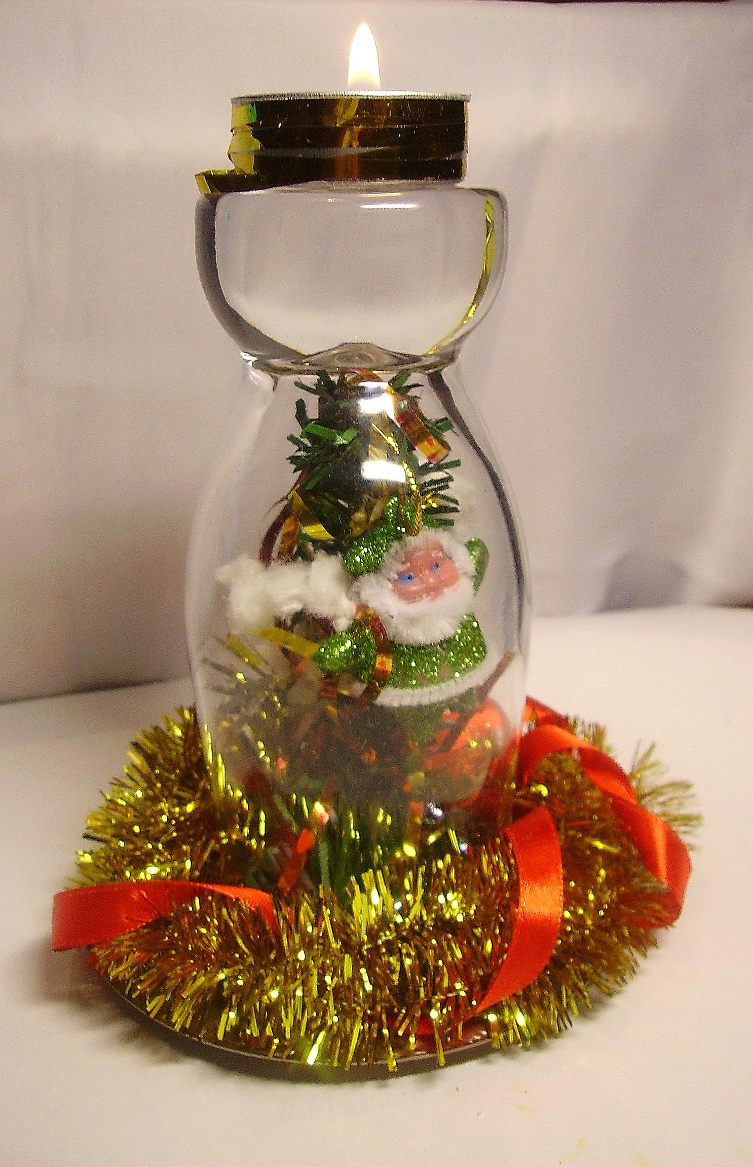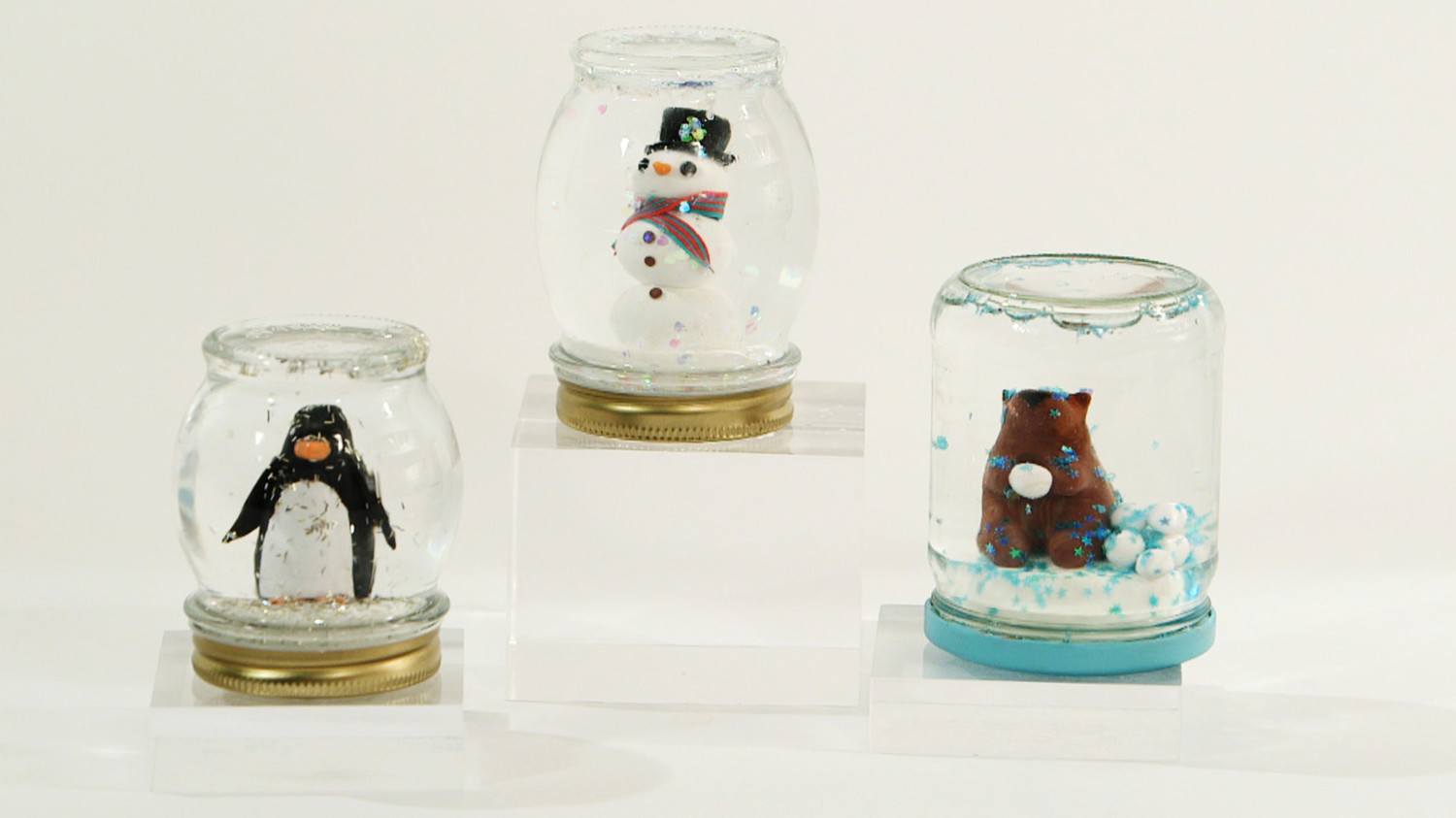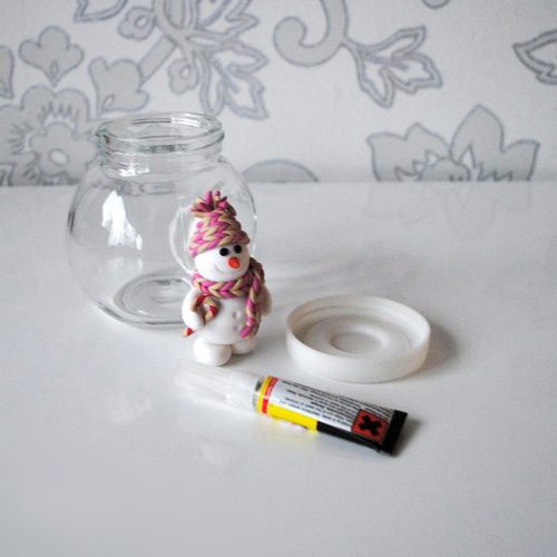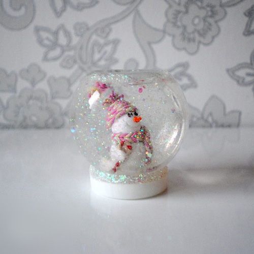 Maintenant, nous commençons à faire le ballon directement. Tout d'abord, couvrez l'intérieur avec de la colle imperméable. Ce peut être un pistolet à colle ou une colle. Après cela, une figurine de bonhomme de neige est collée sur le couvercle et l’espace autour est décoré d’étincelles ou d’un autre décor.