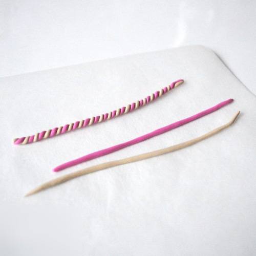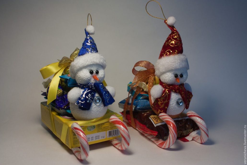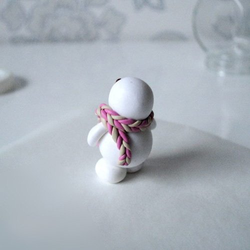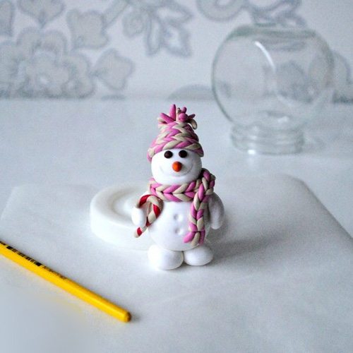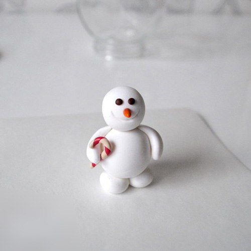 Vous pouvez décorer un bonhomme de neige de différentes manières. Par exemple, donnez-lui un petit bonbon à la main. Pour ce faire, nous roulons plusieurs fines saucisses à partir d'argile multicolore et les roulons légèrement en les tordant ensemble. Ensuite, il ne reste plus qu'à donner à la pièce la forme d'un bonbon. De plus, il peut être recouvert de brillant.