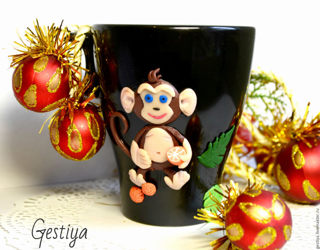 Tout d’abord, sur la tasse, vous devez dessiner les contours de la future figure. Plus loin de l'argile, en utilisant des collations ou d'autres matériaux improvisés, pour aveugler le chien. Prêt figure, cuire au four jusqu'à ce que durci à 120 degrés. Si vous aviez de l'argile blanche, alors vous devez la décorer.