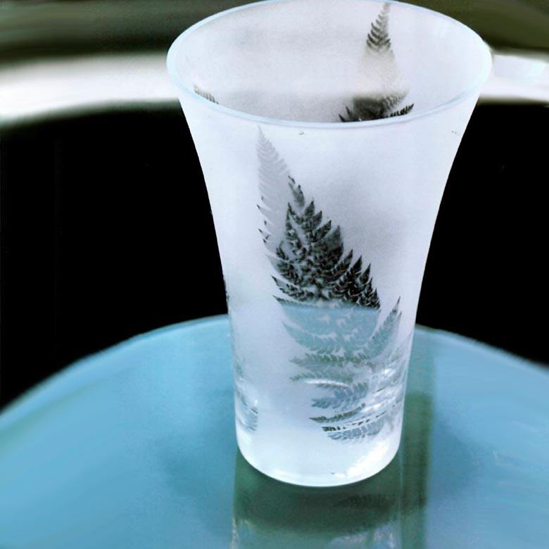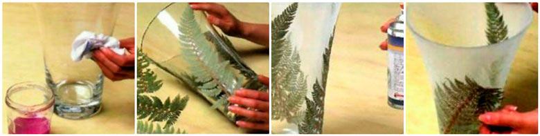 Le récipient en verre doit être dégraissé en l'essuyant avec de l'alcool. En utilisant de la colle, vous devez coller les feuilles préparées. Traiter la surface avec un aérosol de gravure sur verre. Il est important qu'ils ne frappent pas les objets environnants. Après un certain temps, retirez les feuilles et rincez le récipient en verre avec de l'eau.