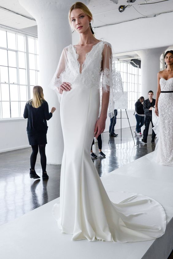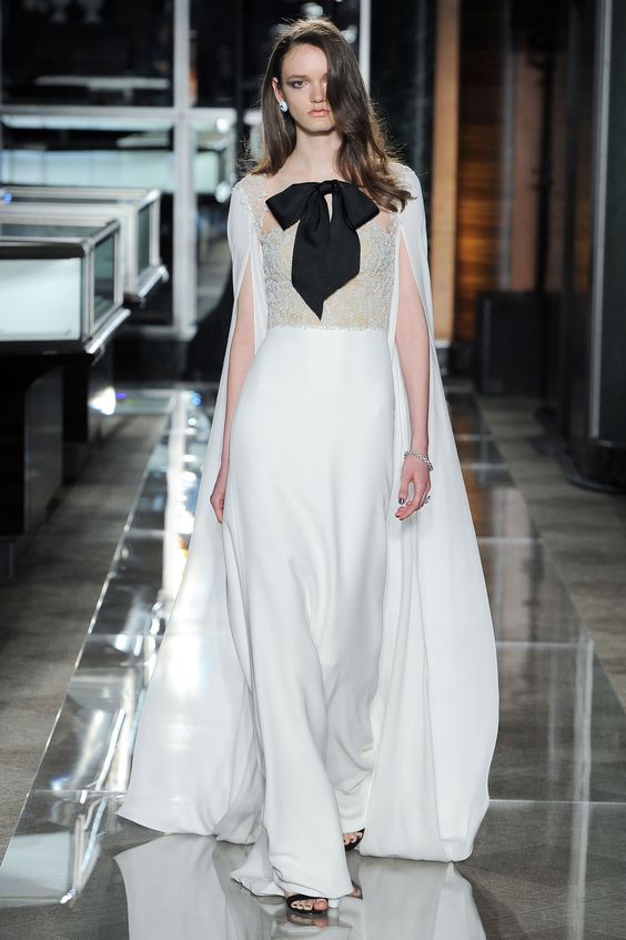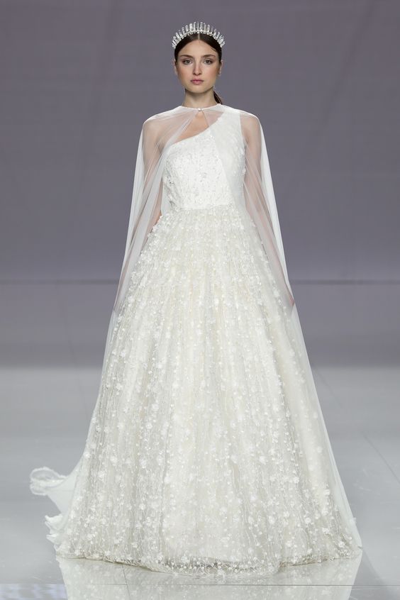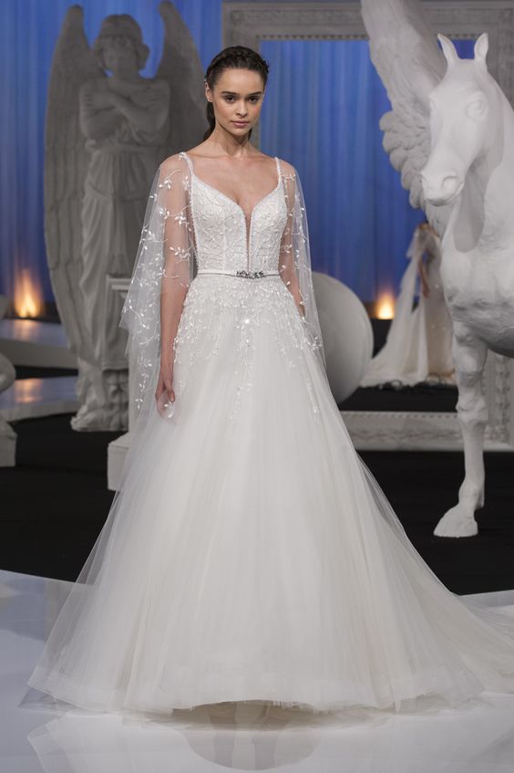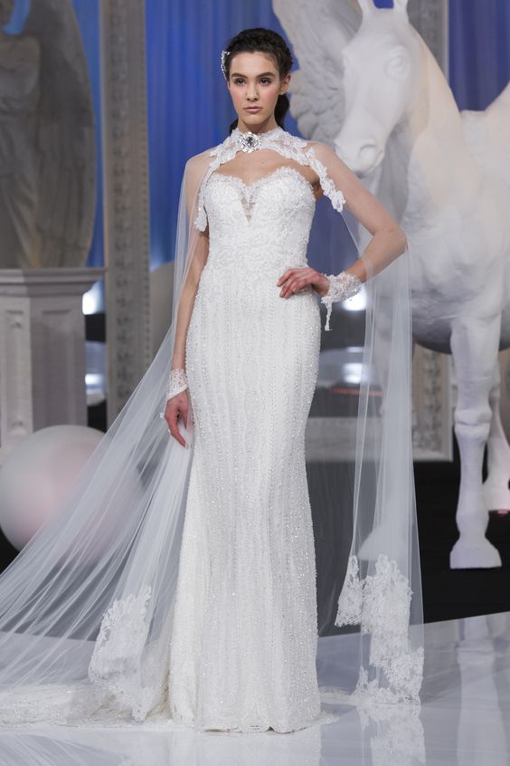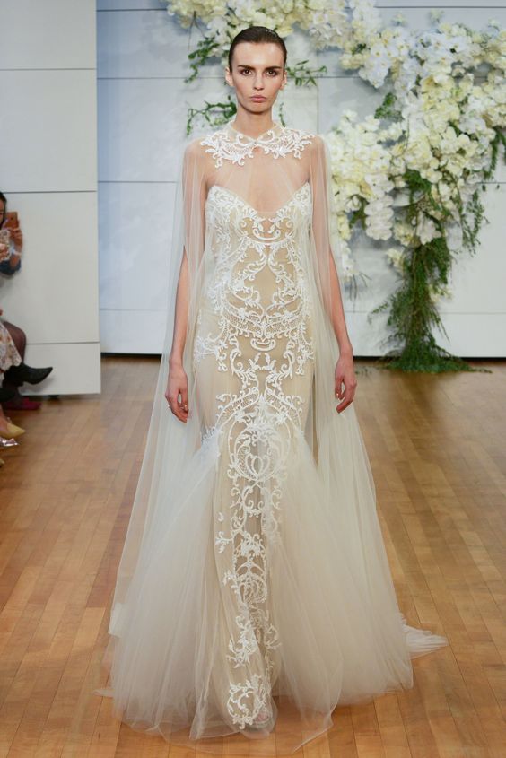Dans l'année à venir, les stylistes offrent une alternative plutôt intéressante à la sélection du voile. Au lieu de cela, il vaut la peine de regarder de plus près la cape en tissu translucide. Si vous le souhaitez, vous pouvez choisir non seulement des modèles restreints, mais également des options avec un décor de dentelle, de plumes, de rubans et de perles. Une telle solution complétera parfaitement une robe de mariée modeste et donnera à l'image une sophistication particulière.