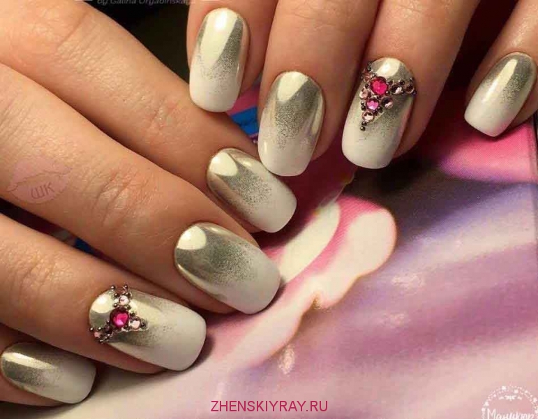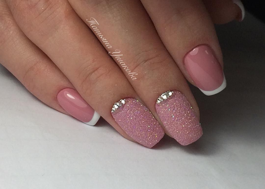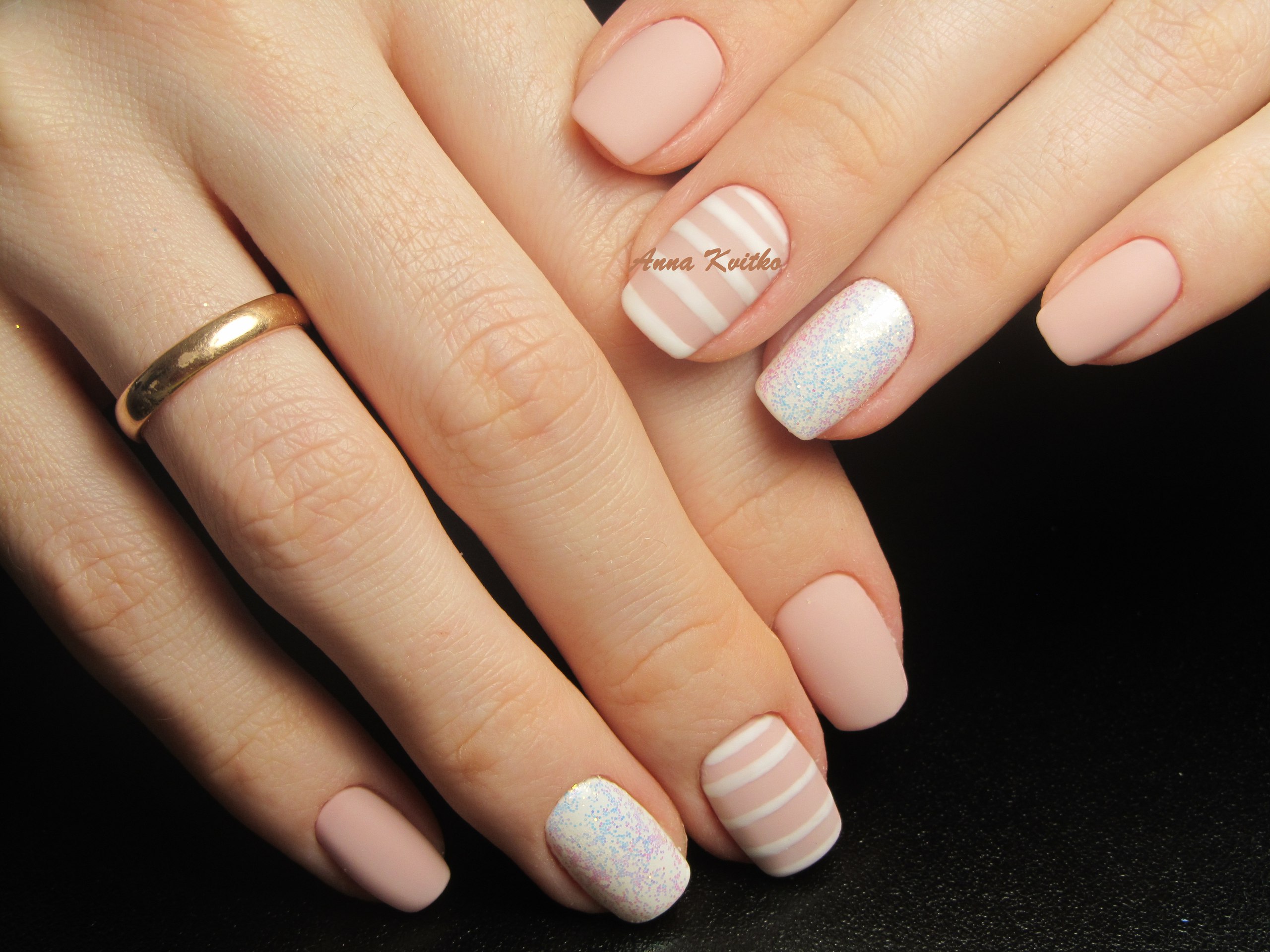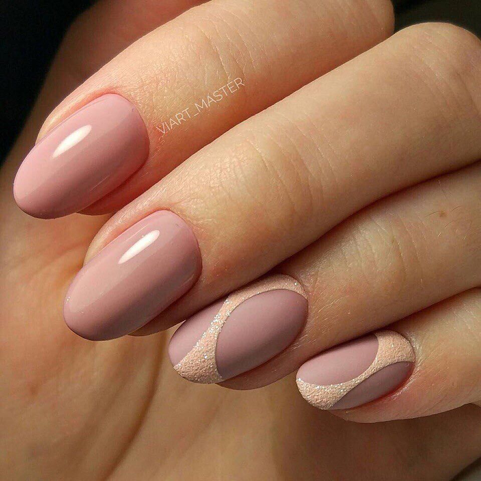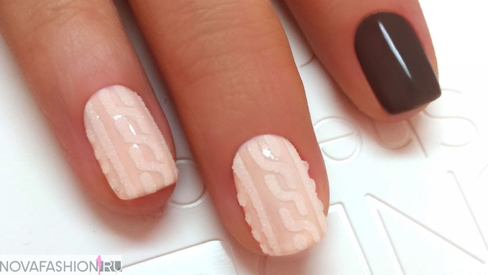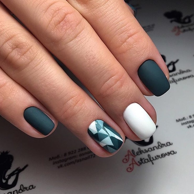 Les tendances modernes disent qu’il est possible et nécessaire de mélanger des textures. L’option la plus en vogue est l’enduit incomplet de l’ongle avec un vernis mat, et remplit l’espace restant de lustre classique, d’étincelles ou de frottement.