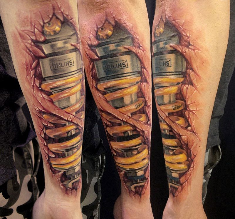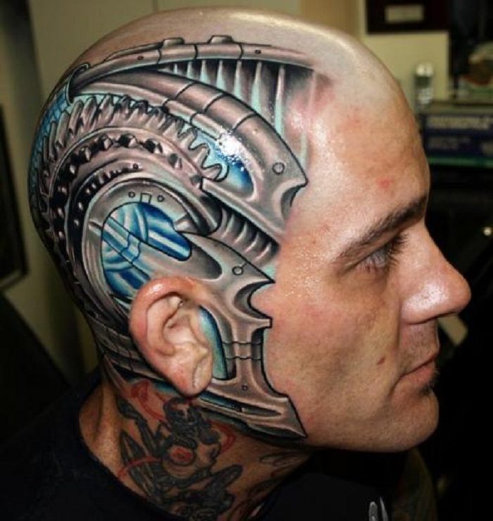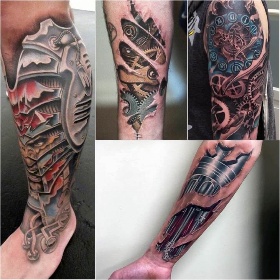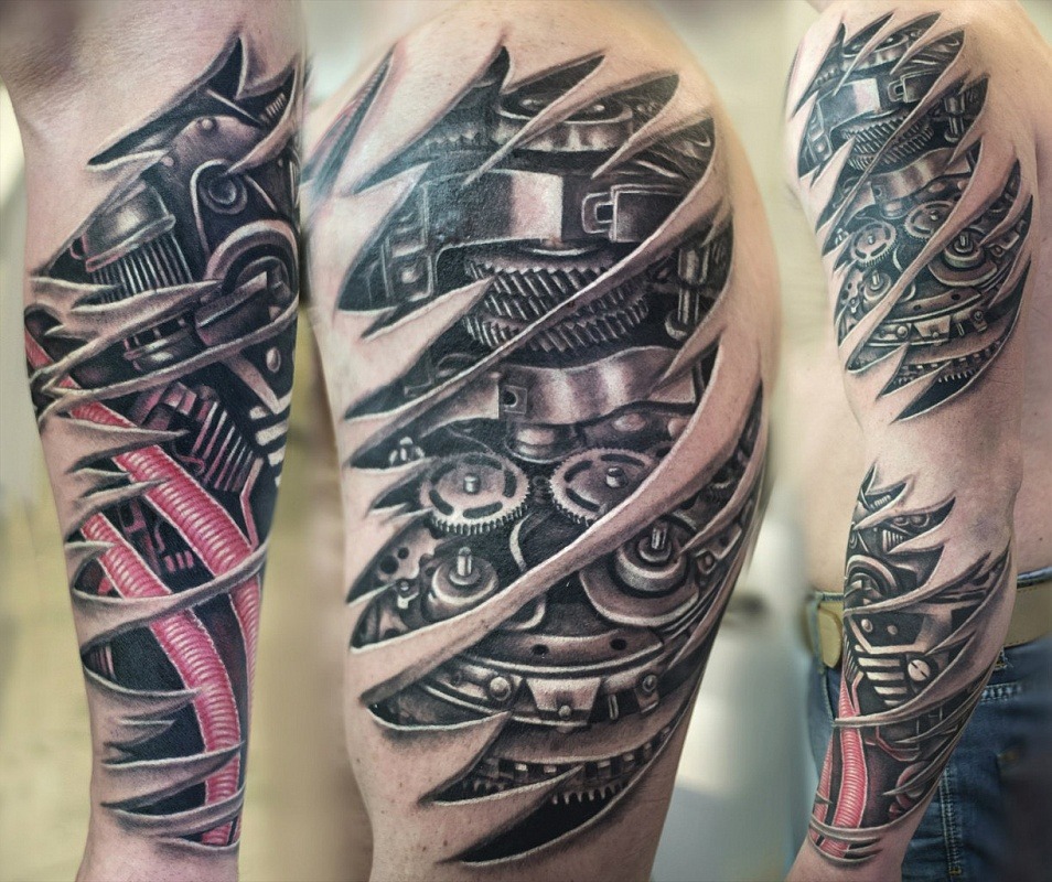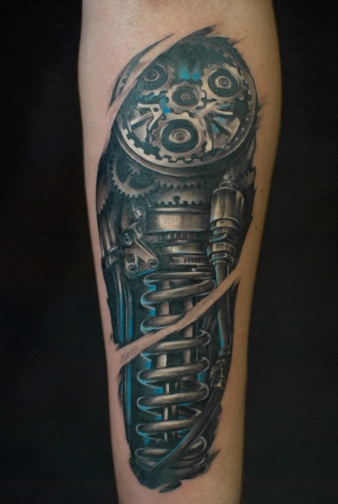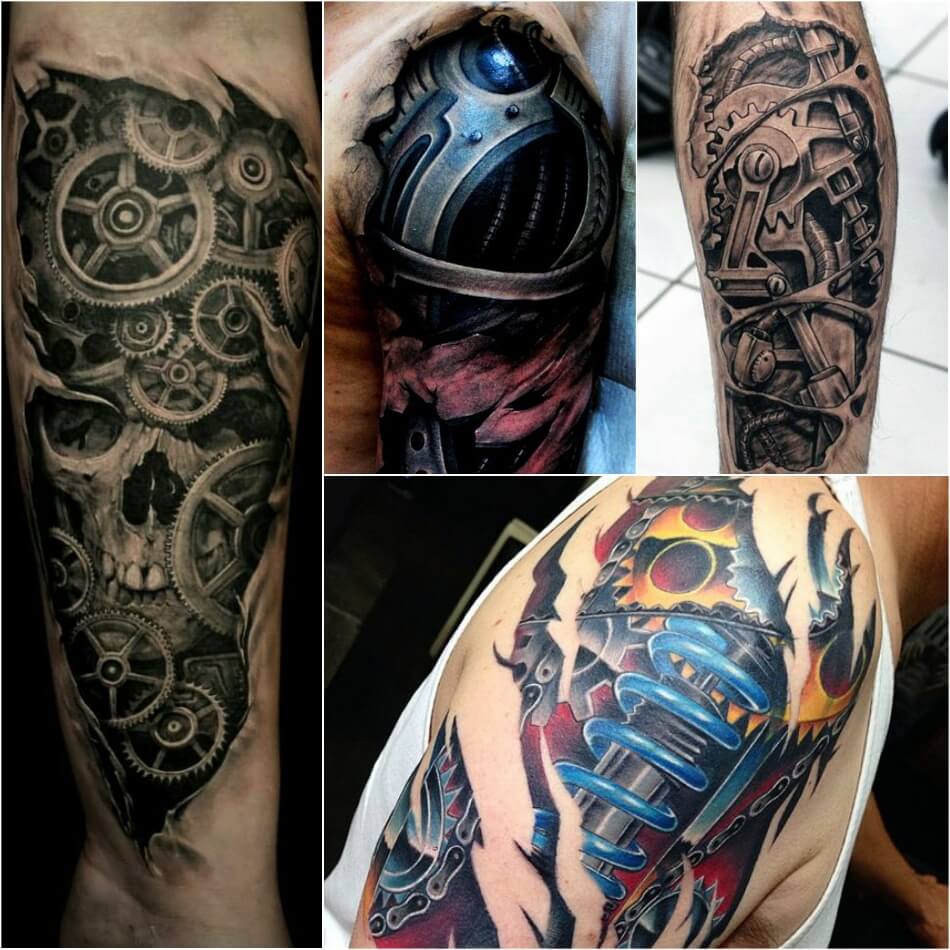 La biomécanique est un style relativement jeune dans l'art du tatouage. Ce format de tatouage original est devenu populaire à la fin du XXe siècle. Biomécanique du tatouage - l'image sur le corps de divers mécanismes, comme si elle déchirait la peau. Des engrenages en acier sophistiqués, des engrenages, des pistons et divers engrenages sont la base d'un tatouage biomécanique. La mode pour un tel tatouage a grandi avec le développement du progrès technologique. Les thèmes de l'intelligence artificielle, des robots et des livres de science-fiction ont suscité l'intérêt du public pour les tatouages dans le style de la biomécanique, ce qui rapproche les gens des cyborgs et des robots.