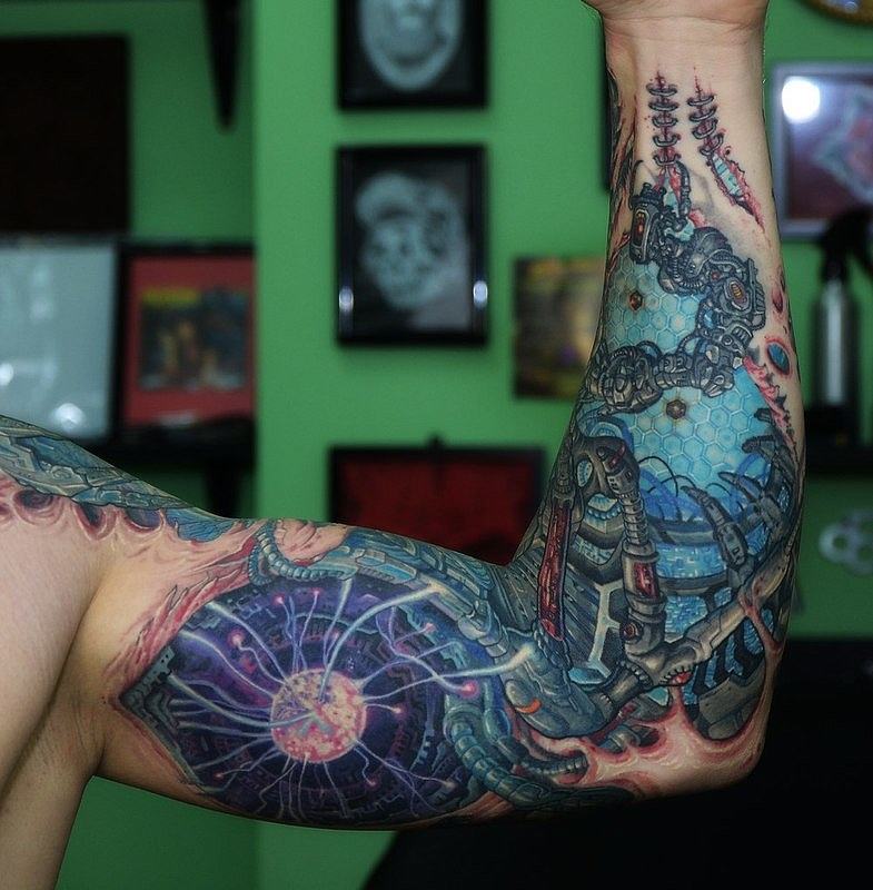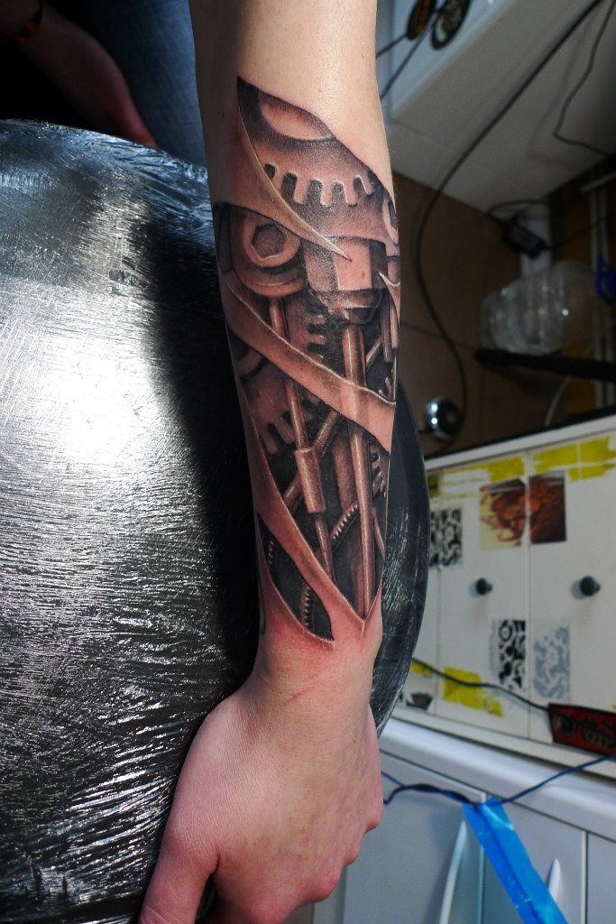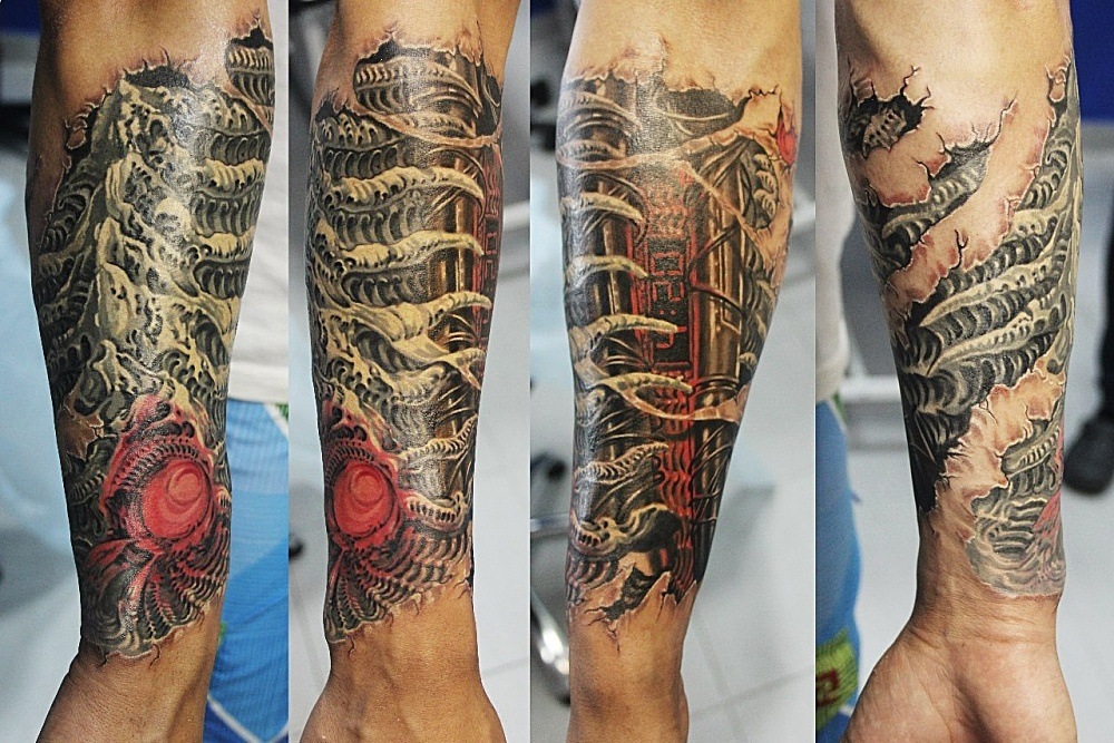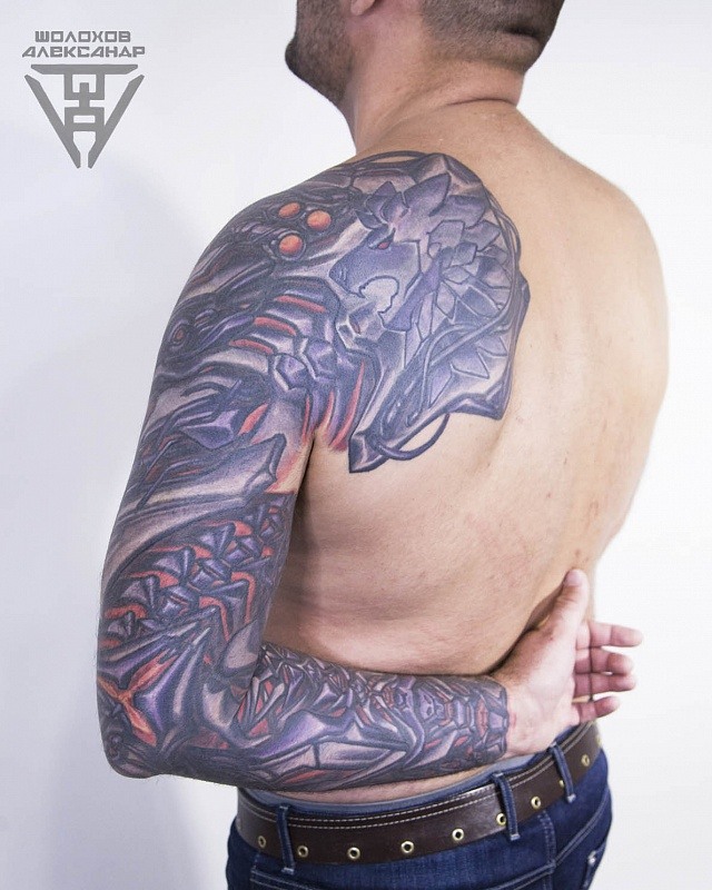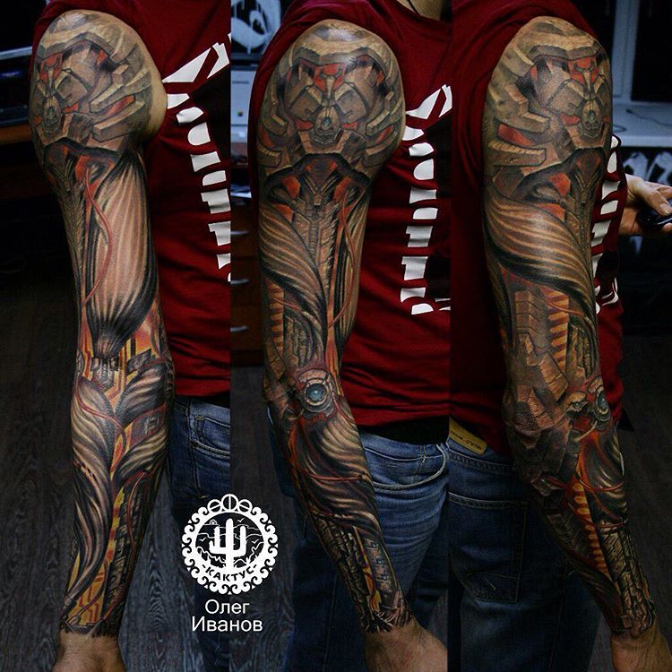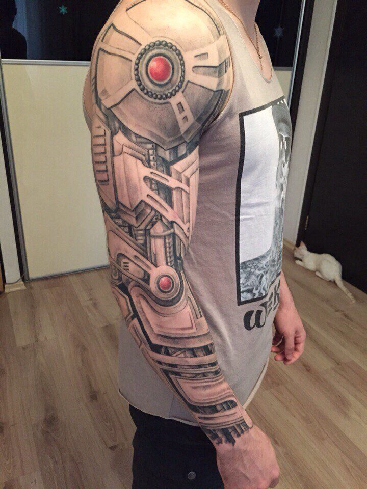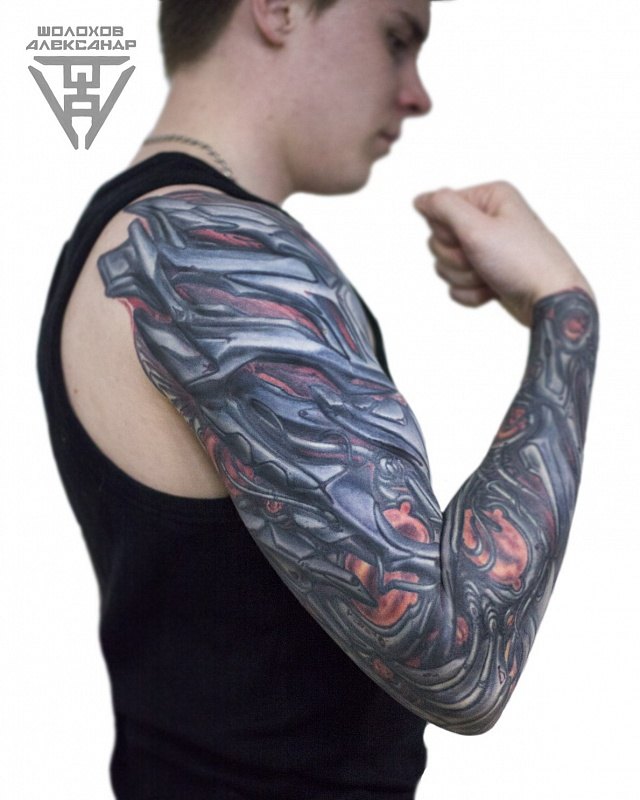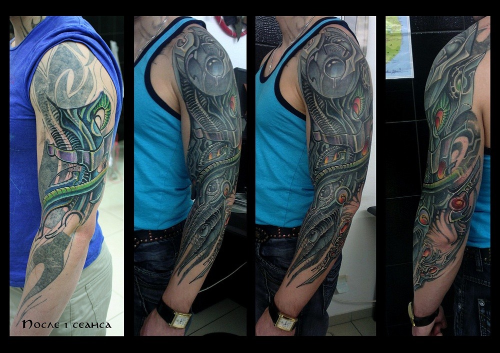 Tatouage "manche", fabriqué dans le style de la biomécanique - travail minutieux, long et beau. Si vous avez choisi un tel tatouage pour vous-même, vous devez vous préparer à plusieurs sessions. Une «pochette» dans le style de la biomécanique est une image en trois dimensions représentant de nombreuses pièces mécaniques. Le tatouage "manche" a l'air impressionnant et original. Le temps passé et l'endurance en valent la peine.