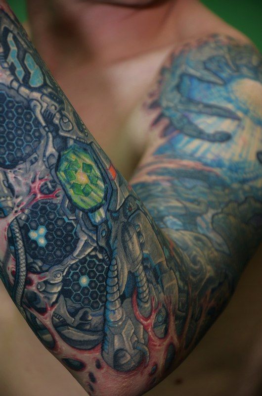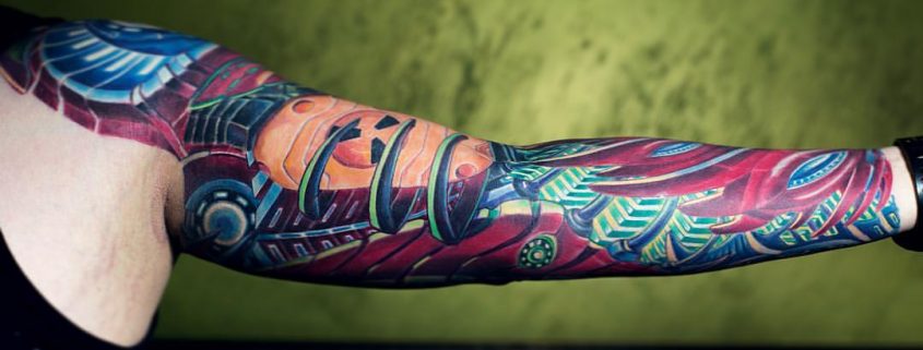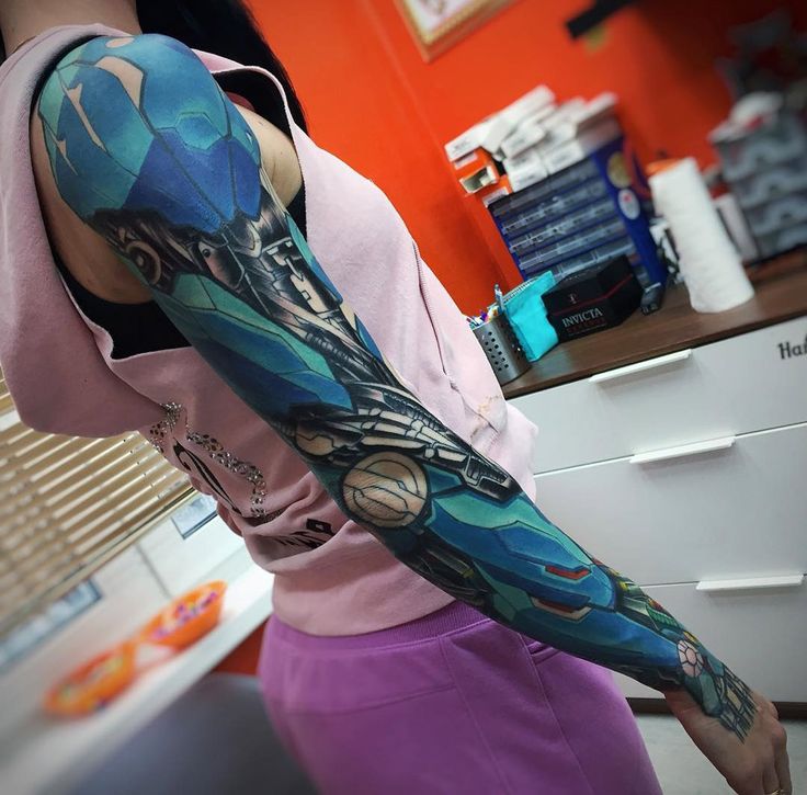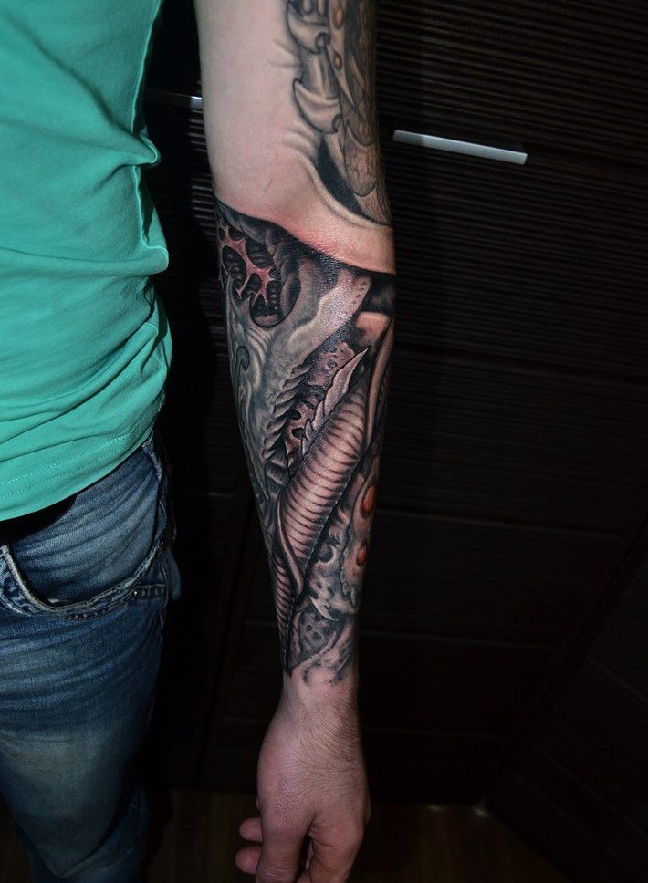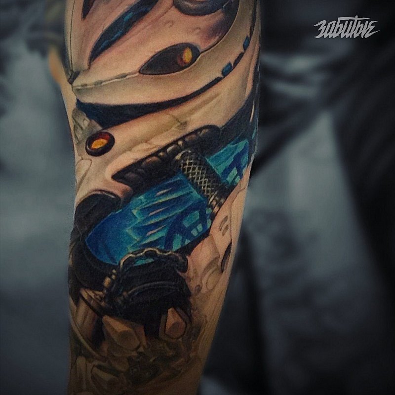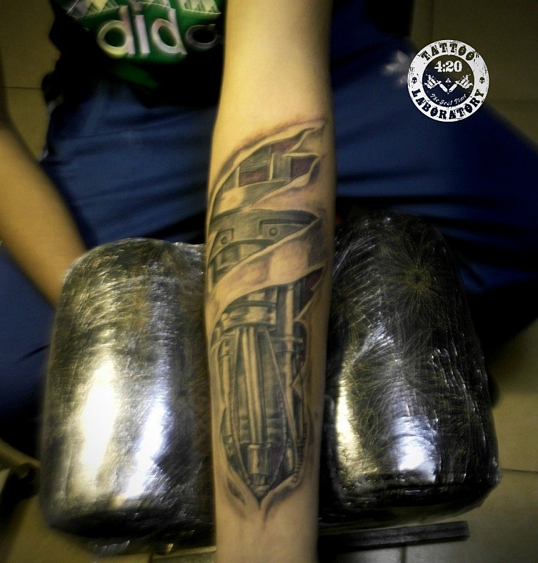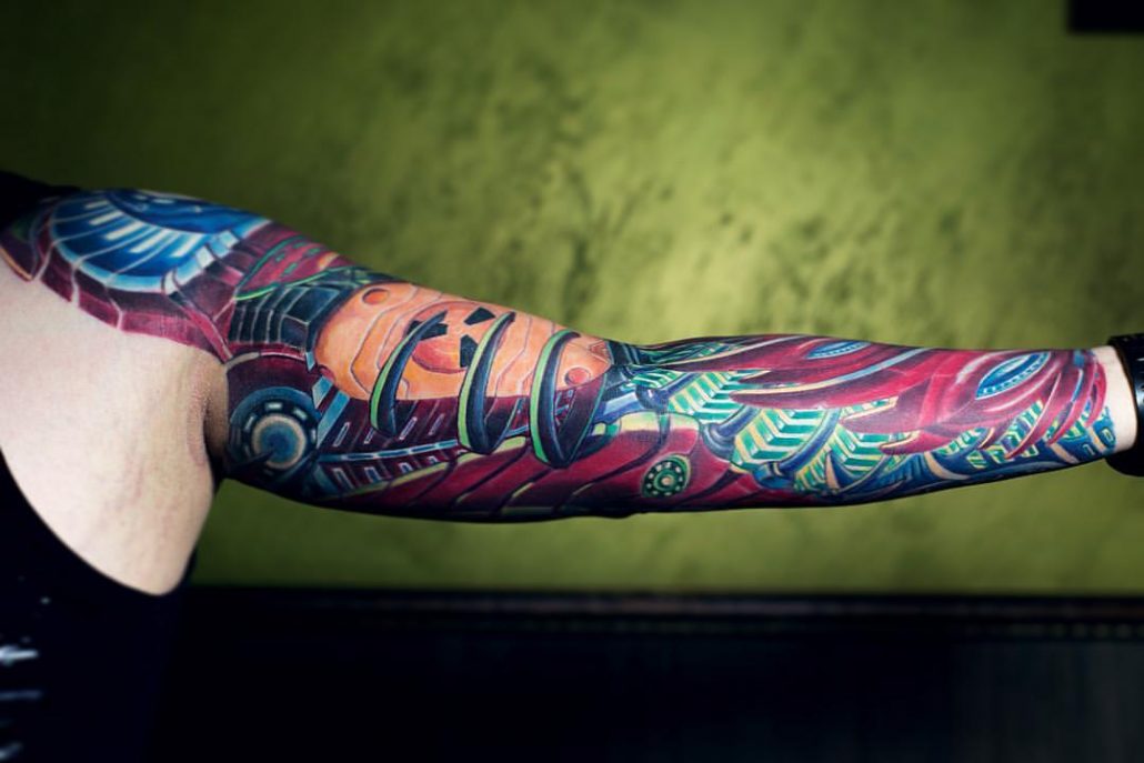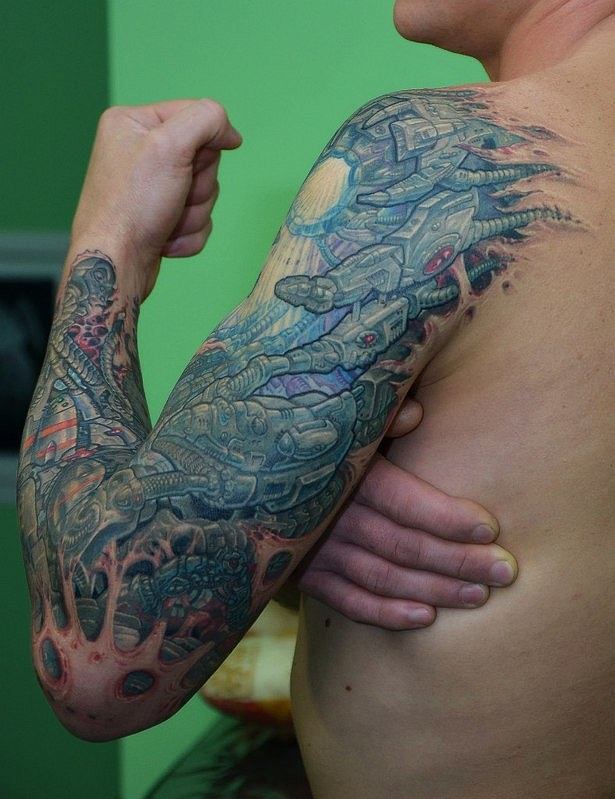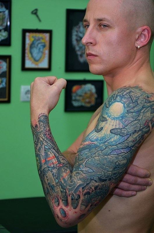 Tatouage "manche", fabriqué dans le style de la biomécanique - travail minutieux, long et beau. Si vous avez choisi un tel tatouage pour vous-même, vous devez vous préparer à plusieurs sessions. Une «pochette» dans le style de la biomécanique est une image en trois dimensions représentant de nombreuses pièces mécaniques. Le tatouage "manche" a l'air impressionnant et original. Le temps passé et l'endurance en valent la peine.