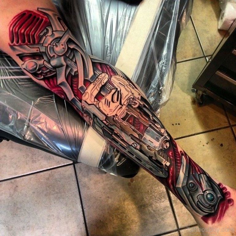 La biomécanique du tatouage, réalisée sur la jambe, semble très rentable et attrayante. L'image de nombreux engrenages, pistons et fils est idéale pour les tatouages sur la jambe. Ici, vous pouvez représenter un tatouage d'une taille plus grande que sur le bras ou l'épaule, ce qui signifie que le nombre de détails du «mécanisme» peut être beaucoup plus grand. Le motif volumineux et allongé aura fière allure sur la jambe, en commençant par la hanche et se terminant par le bas de la jambe.