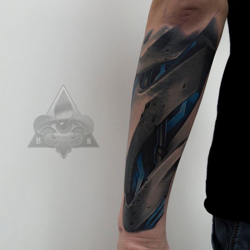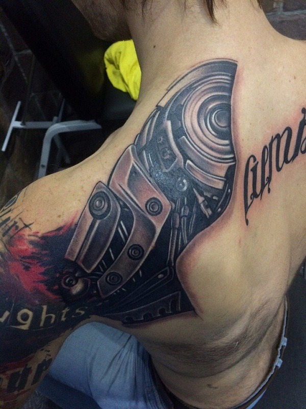 La biomécanique du tatouage, réalisée sur l'épaule, est très élégante et impressionnante. Cet effet envoûtant est créé par le fait que les muscles de l’articulation de l’épaule complètent le tatouage et lui donnent du volume. Le dessin de style biomécanique est tridimensionnel et réaliste.