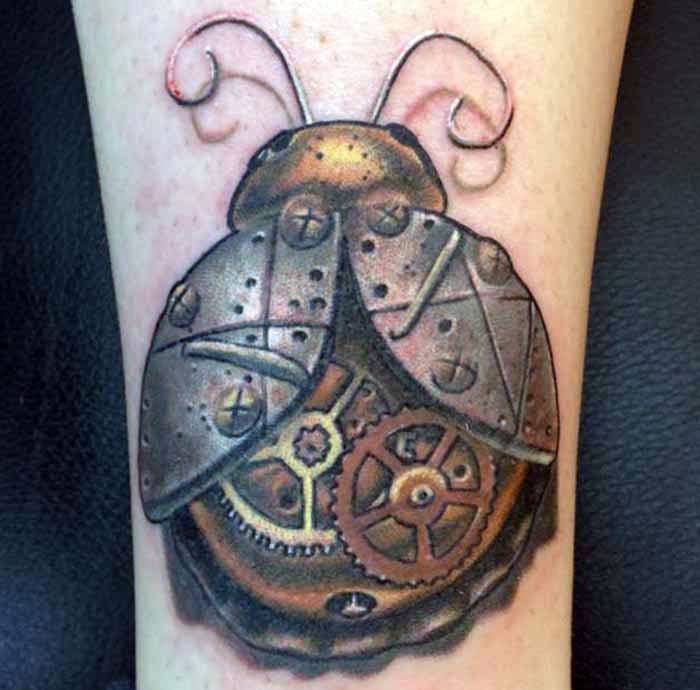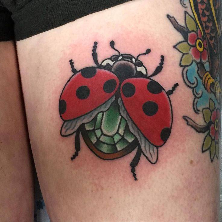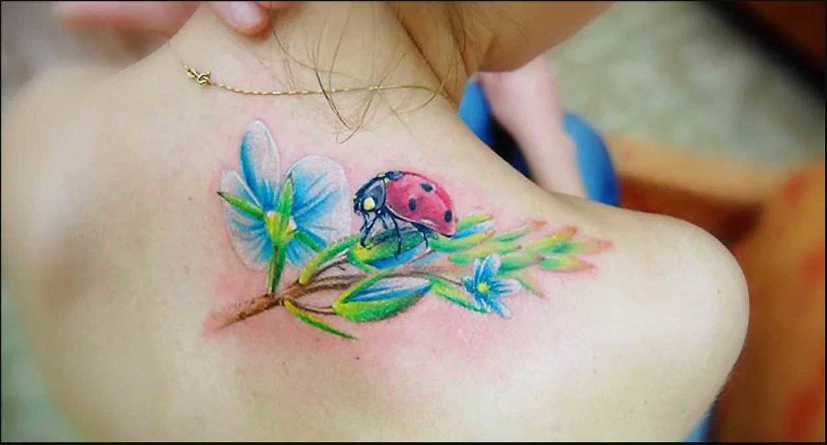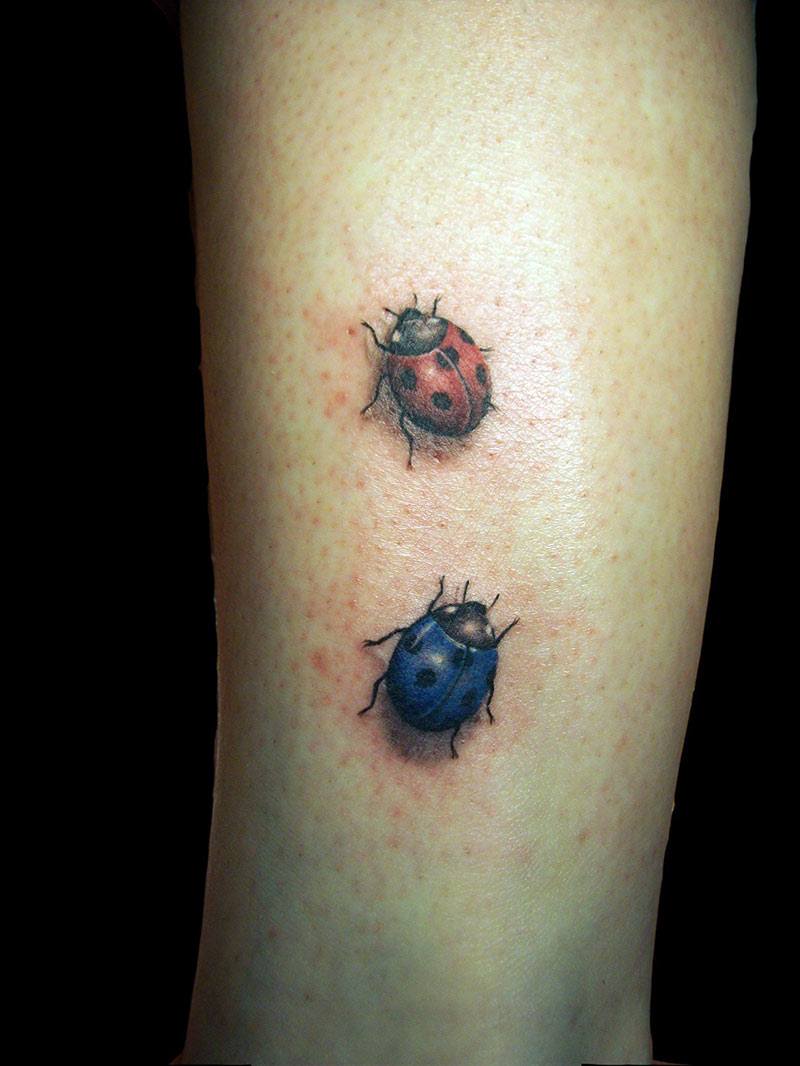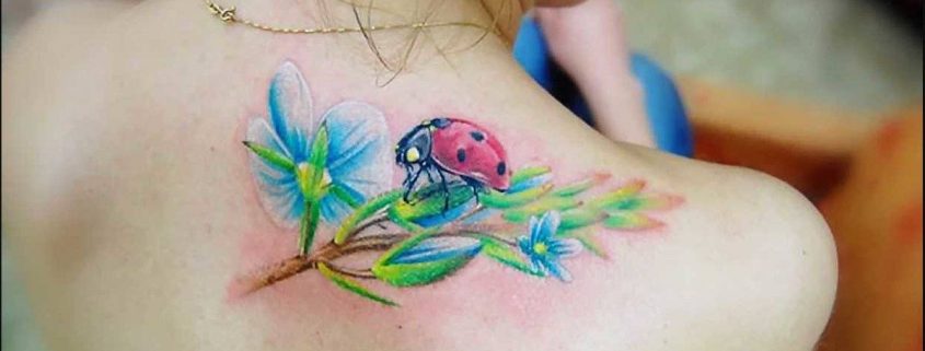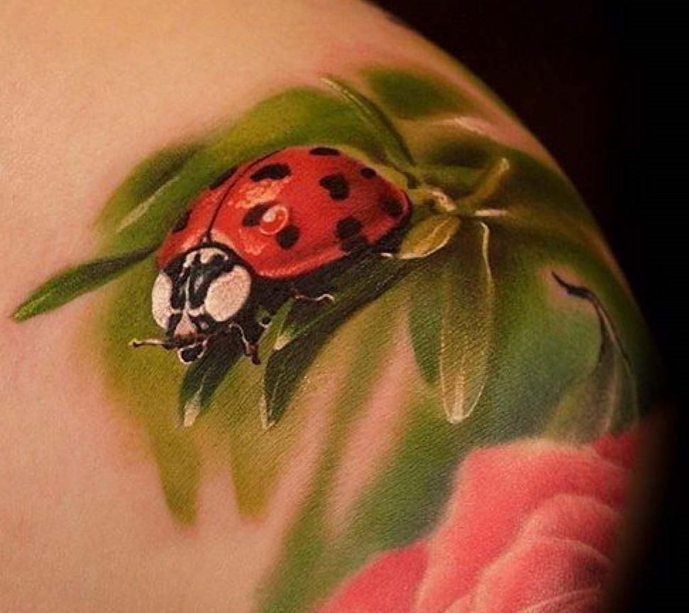 Beaucoup de tatoueurs pensent qu'un tatouage en couleurs donnera à l'image un dernier point fort. D'accord, car la coccinelle de couleur aura l'air plus joyeuse et lumineuse. Un tatouage avec un tel insecte peut être fait dans différents styles. Par exemple, style aquarelle, vieille école, école de presse, traditionnel et réalisme. Si vous ne pouvez pas décider de la technique de l'image, il est préférable de contacter un maître expérimenté, il vous aidera et vous conseillera.