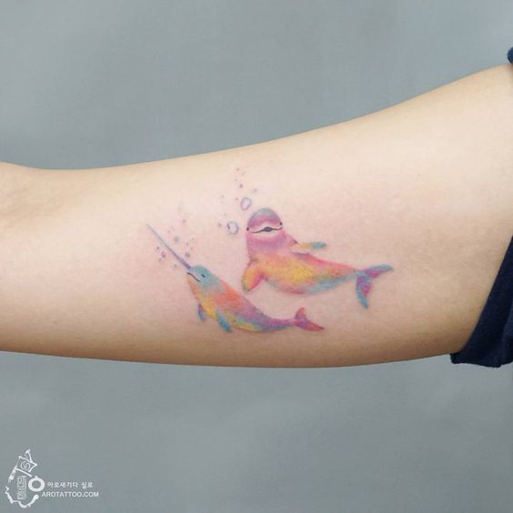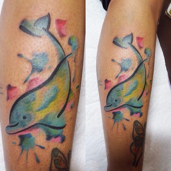 Les filles font un tatouage à l'aquarelle avec un dauphin en talisman. Ainsi, ils montrent non seulement leur affection et leur amour pour cet animal, mais également leur foi en la gentillesse. Les encres aquarelles brillantes sont spectaculaires. Et comme protection contre les malheurs, un tatouage coloré de dauphin est un talisman puissant et efficace, qui protège du mauvais œil, de l’envie et de la colère.