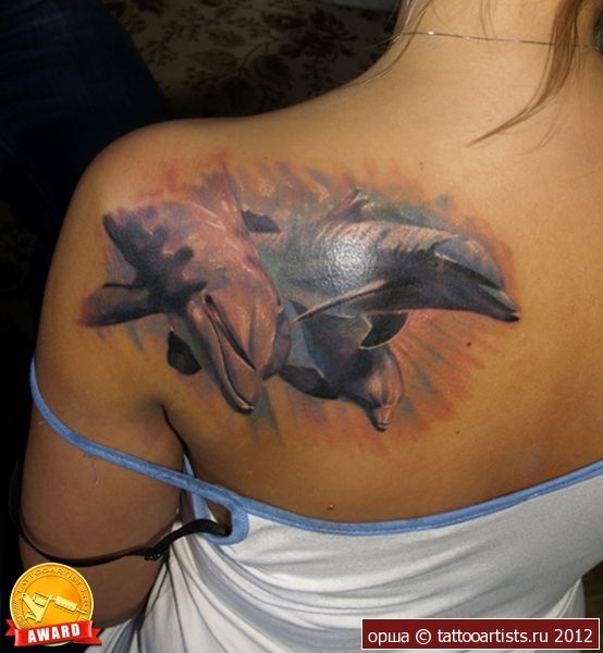 En choisissant un tatouage de dauphin sur l'omoplate, la jeune fille veut montrer son désir de liberté, d'intelligence, de jeu et de caractère. Les propriétaires de ces tatouages sont des gens ordinaires, sympathiques et souriants.