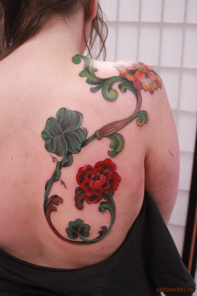 Les filles portant l’image d’un trèfle à quatre feuilles attirent l’attention des hommes. Ils ne se plaignent jamais de mauvais prétendants et se marient toujours avec bonheur. Souvent, un symbole de réussite est représenté avec une belle rose en signe d'amour sincère pour son élu. Mais l'image du trèfle avec la violette signifie une douleur sans fin pour une personne. Un tatouage incroyablement beau et doux ressemble à la jambe de la femme, la rendant plus élégante. L’image sur les omoplates est également une bonne option pour les filles. À ce stade, le dessin semble très inhabituel et, surtout, le processus de demande est presque indolore.
