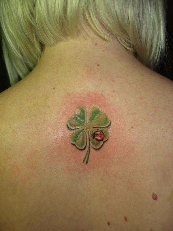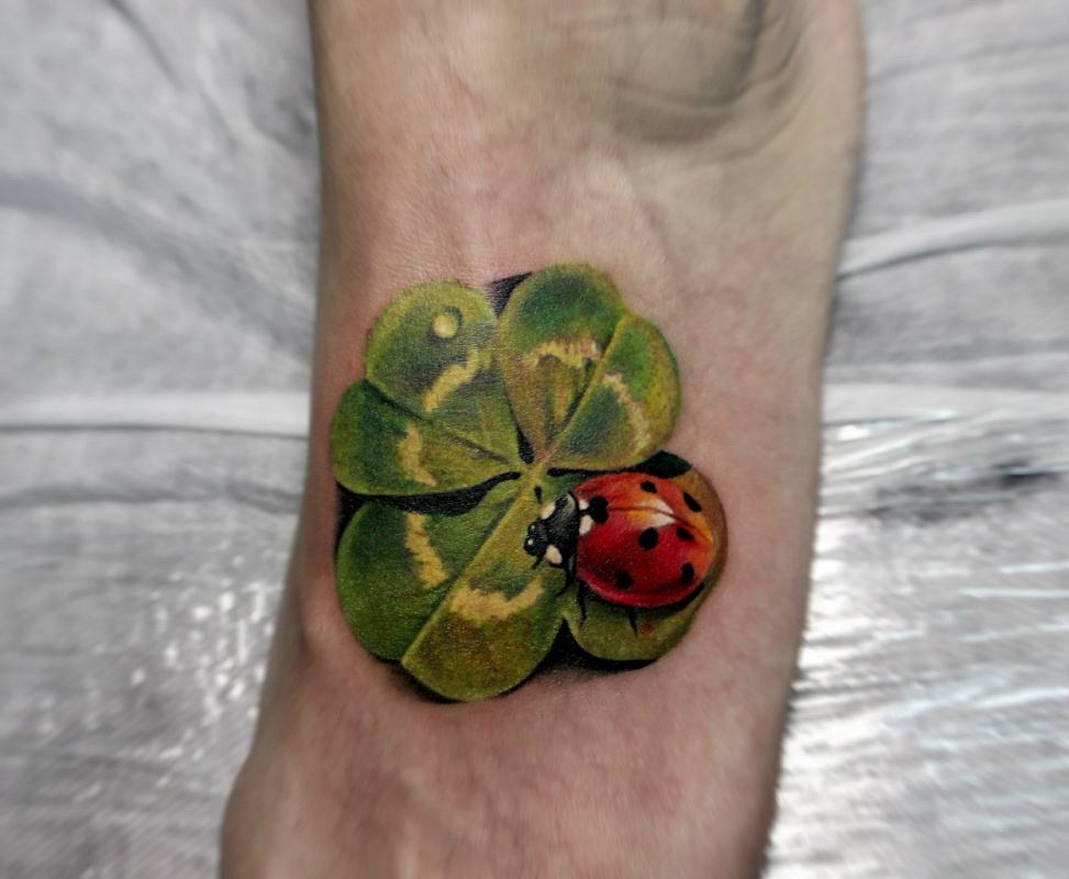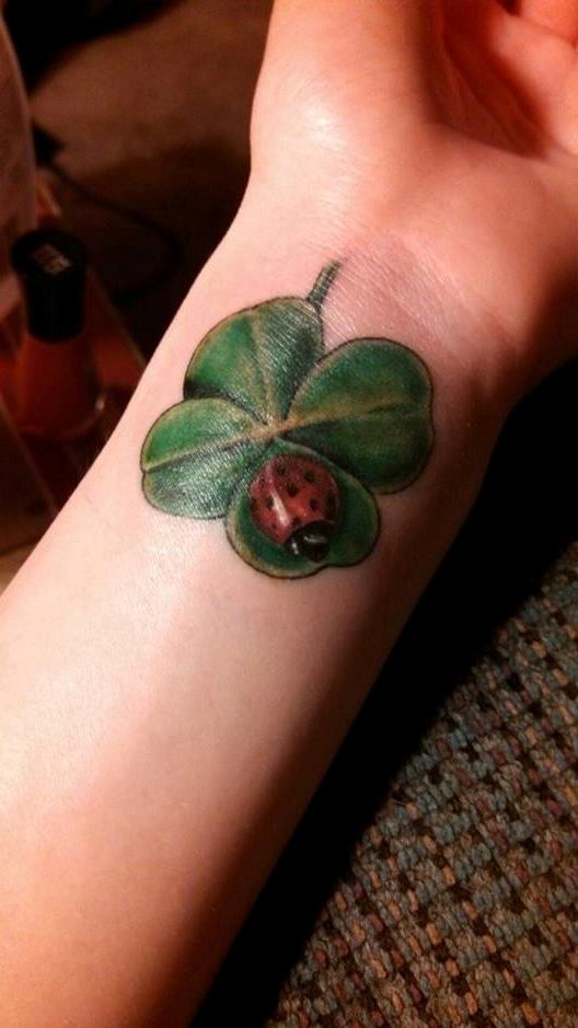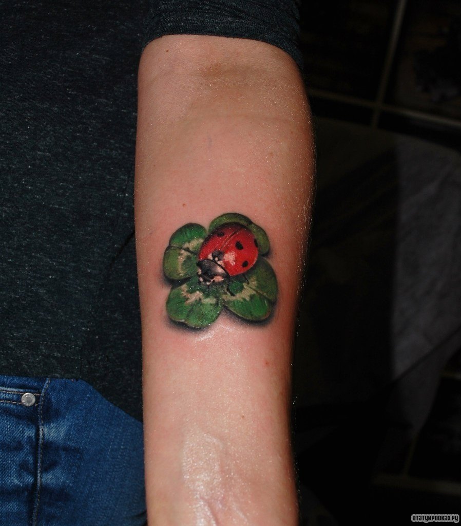 Un tatouage de trèfle avec un compagnon est très populaire, avec une coccinelle posée sur le dessus ou à côté de la feuille, surtout si la plante a quatre feuilles. Cette combinaison renforce encore la valeur positive du tatouage, symbolise le succès, attire la chance de son propriétaire. Ce tatouage convient aux hommes et aux femmes.
