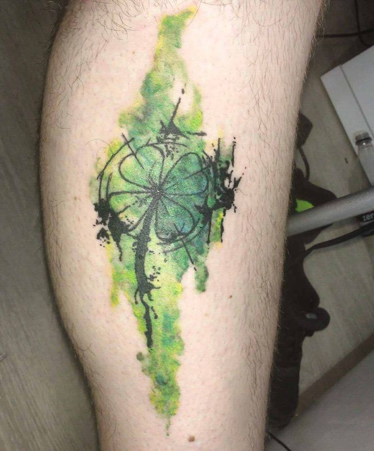 Pour les hommes, le trèfle à quatre feuilles revêt une importance particulière car il symbolise le succès et la chance. Un homme avec un tel tatouage est considéré comme unique et spécial. Les gars appliquent un tel tatouage réussi sur leurs mollets, ce qui contribue à leur augmentation visuelle. Un trèfle à quatre feuilles à l'arrière de la colonne semble très original.