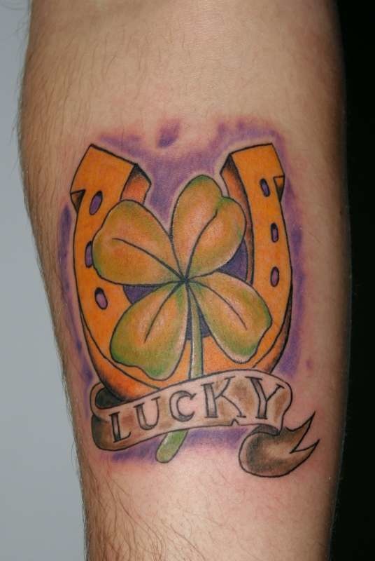 La combinaison de fers à cheval et de trèfle n'est pas moins courante. Ceci est fait pour fixer la fortune de son côté et être toujours avec elle. Il existe de nombreuses variantes du tatouage: l'accent peut être mis sur le fer à cheval autour duquel le trèfle s'enroule, ou au contraire, placez le fer à cheval derrière les feuilles de manière à ce que seule sa fin puisse être vue. Options très populaires pour l'emplacement des cornes en fer à cheval à gauche ou en haut. Dans le premier cas, cela ressemble à une lune en croissance, ce qui augmente le bien-être de son propriétaire. Et dans le second cas, le fer à cheval est comme un bol d'abondance, rempli d'une grande prospérité.
