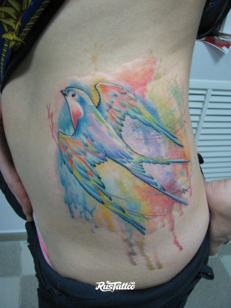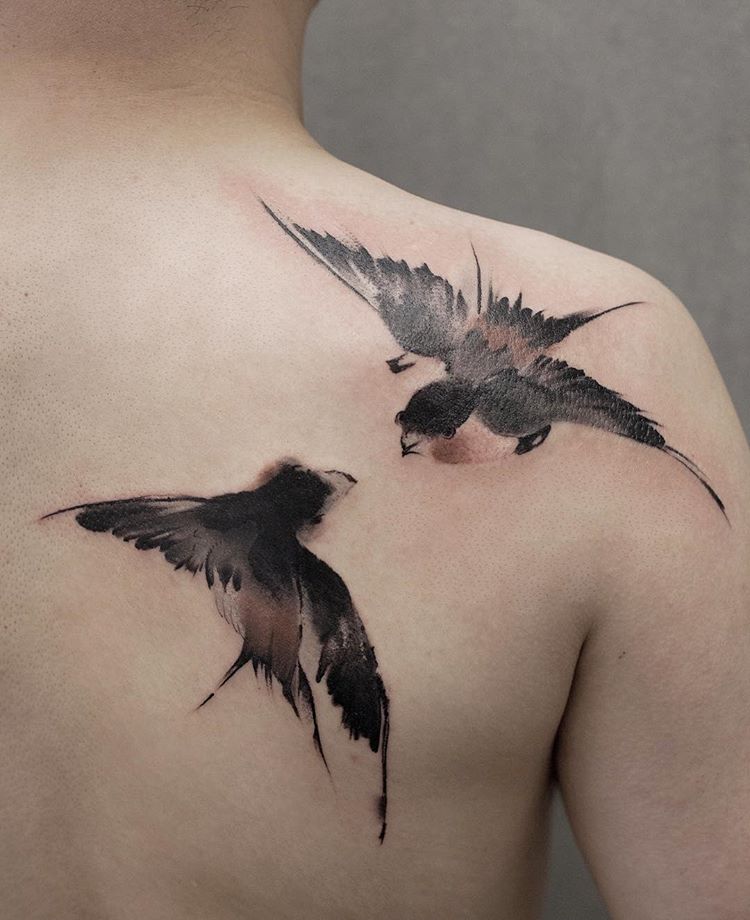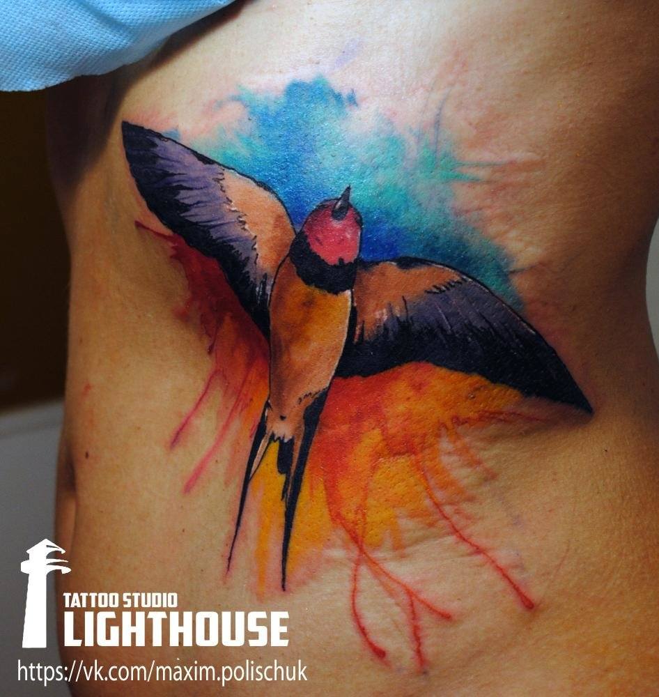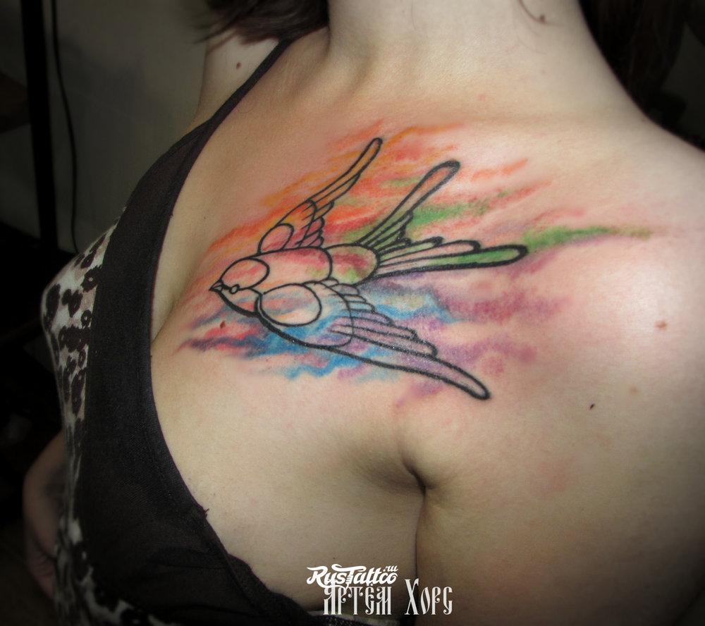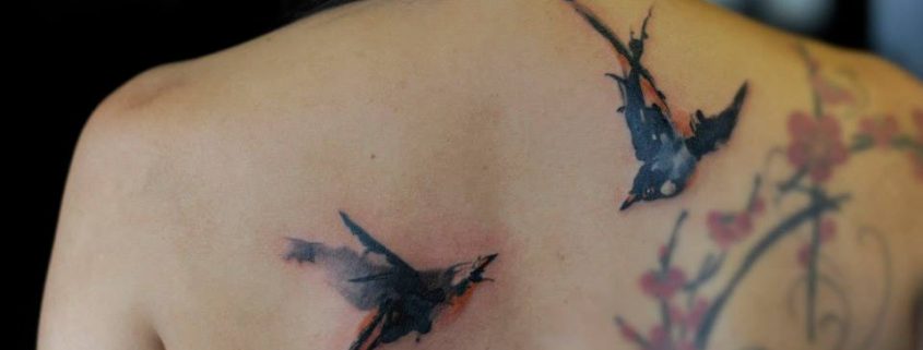 Superbe tatouage hirondelles dans le style de l'aquarelle. Lisses, belles transitions de couleurs, des touches de peinture semblent laisser une marque sur le rabat d'aile. La technique de l'aquarelle permet de transmettre la facilité et le réalisme du vol d'un oiseau. Une telle image d'hirondelle aura fière allure dans une petite et une grande image.