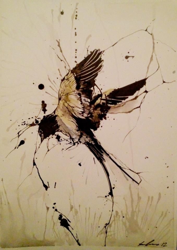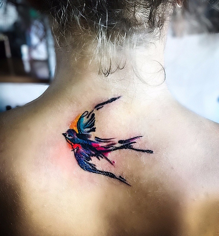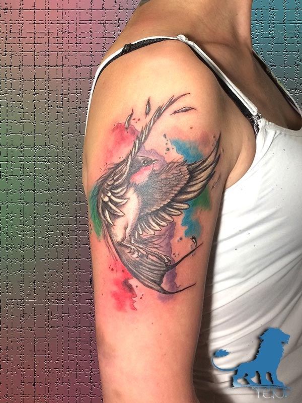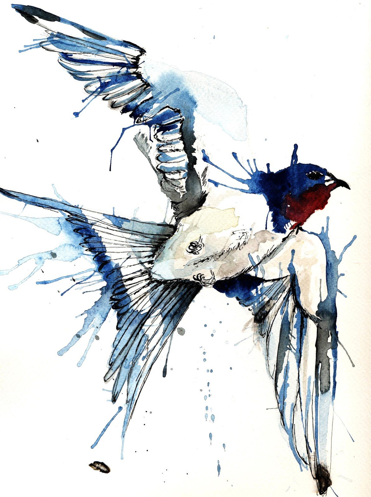 Superbe tatouage hirondelles dans le style de l'aquarelle. Lisses, belles transitions de couleurs, des touches de peinture semblent laisser une marque sur le rabat d'aile. La technique de l'aquarelle permet de transmettre la facilité et le réalisme du vol d'un oiseau. Une telle image d'hirondelle aura fière allure dans une petite et une grande image.
