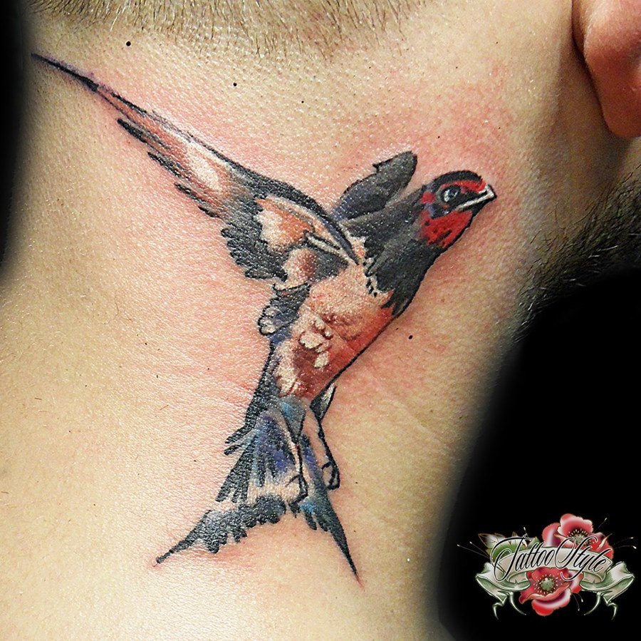 Après avoir mis un tatouage d'hirondelle sur le cou, son propriétaire veut montrer au monde entier qu'il cherche une protection qui lui permettrait d'aller de l'avant avec succès. Le plus souvent, un tel tatouage est représenté avec divers ajouts. Une hirondelle avec un trèfle, une baie ou une fleur au bec est très attrayante. Très souvent, un tel tatouage est complété par diverses inscriptions ou une fine chaîne.
