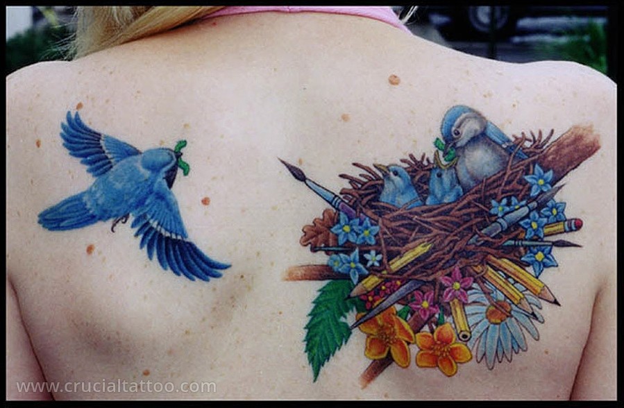 Le tatouage d'hirondelle est mieux fait en couleur. Très souvent, l'hirondelle est représentée avec une poitrine rouge. Les hirondelles de tatouage de regard merveilleuses et réalistes dépeintes en vol ou assises sur une branche. Et la variante du dessin de l’hirondelle dans le nid, et même avec les poussins, semble intéressante et romantique. Ce croquis suggère que son propriétaire donne la priorité à la famille et aux valeurs familiales. Un tel tatouage a une taille assez grande, il est donc préférable de transférer le dessin du croquis à l'omoplate ou à la poitrine.