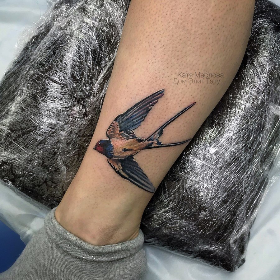 Un petit tatouage d'hirondelle sur la jambe est très sexy et sexy. Ici, vous pouvez représenter un seul oiseau en vol ou essayer d'appliquer plusieurs oiseaux de différentes tailles, ce qui donnera à un tel tatouage un aspect naturel et attrayant.