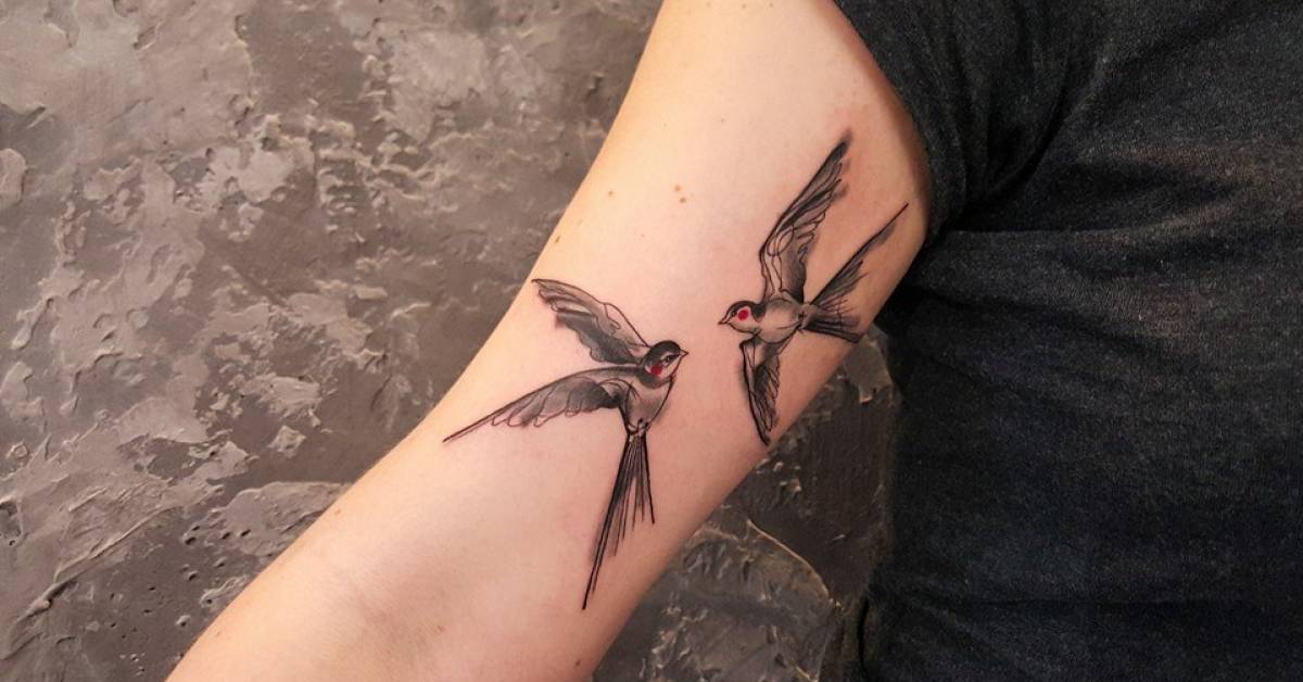 Une paire de tatouages à l'hirondelle est souvent appliquée par les couples amoureux. Ayant représenté des oiseaux identiques au poignet, un gars et une fille veulent montrer aux autres leur amour, leur loyauté et leur dévotion. Après avoir tatoué plusieurs hirondelles sur son corps, une personne veut montrer qu’elle est pressée de vivre, qu’elle a des pensées et un esprit purs. Très souvent, l'image de plusieurs hirondelles est provoquée par des personnes qui manquent de chance, de dextérité et de rapidité.