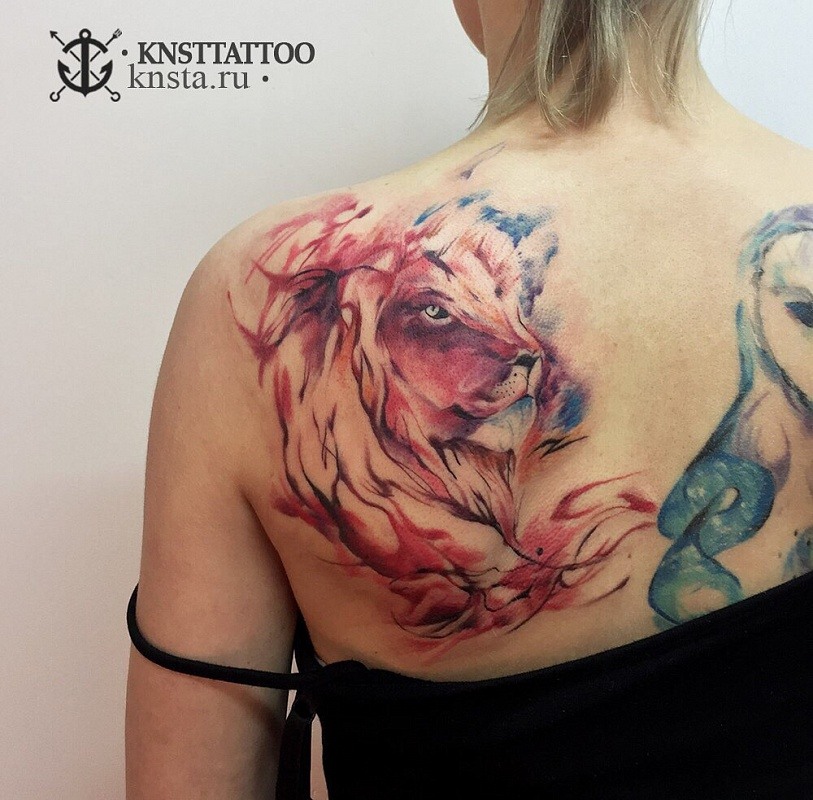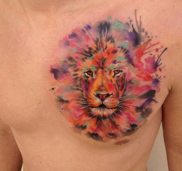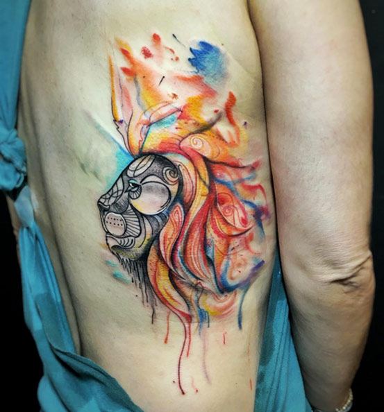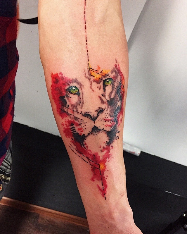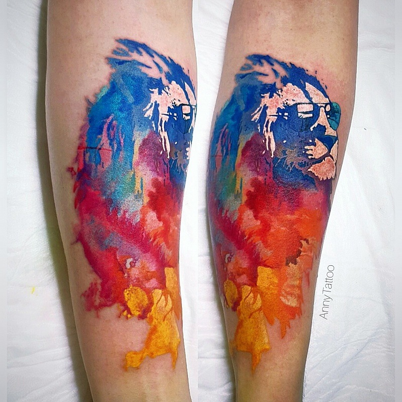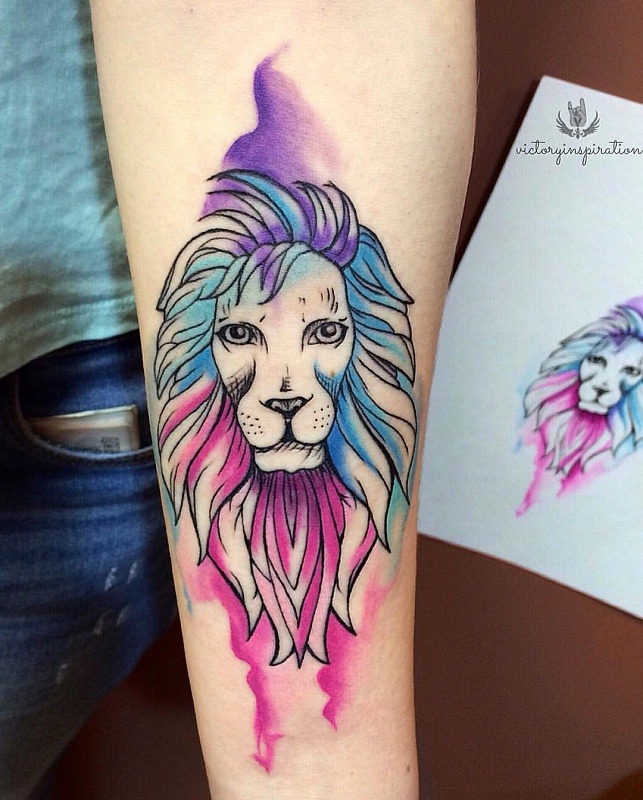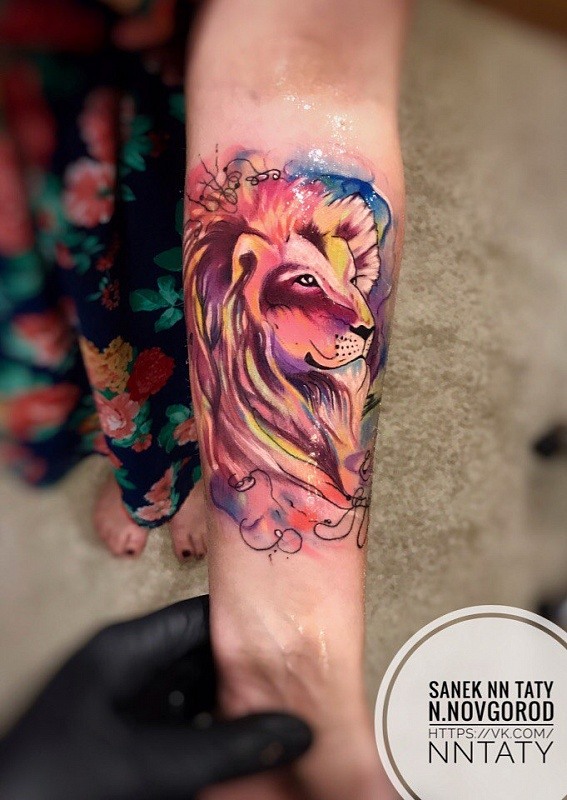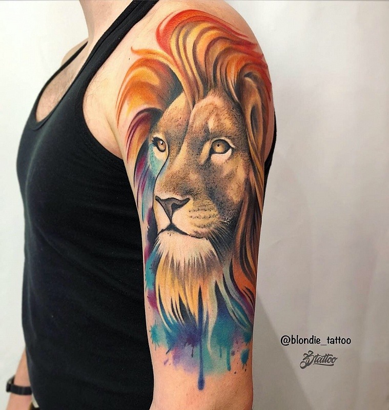 Très souvent, les gens modernes peuvent voir un tatouage coloré avec un lion, réalisé à l'aquarelle. Ce style est préféré par les personnalités purement individuelles et dynamiques. Mais le tatouage de couleur avec le roi du monde animal, réalisé dans un format de bande dessinée, semble particulièrement extravagant. Il est de coutume de remplir les tatouages géométriques avec de l'encre noire, mais un lion coloré de plusieurs lignes a l'air beaucoup plus spectaculaire.