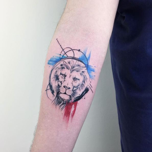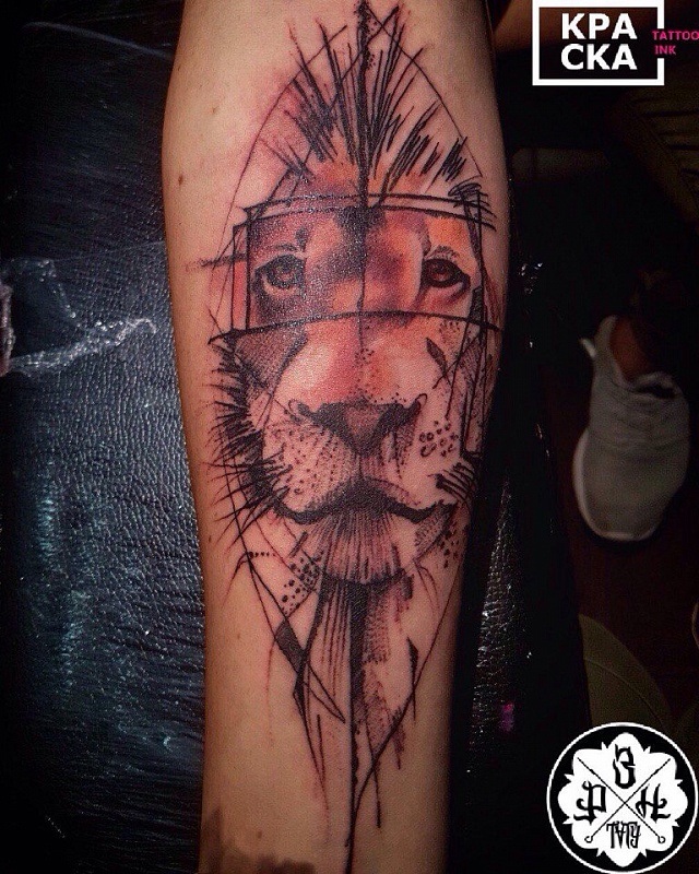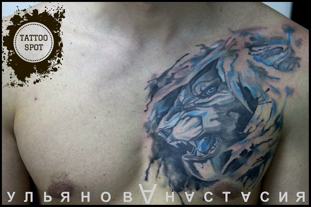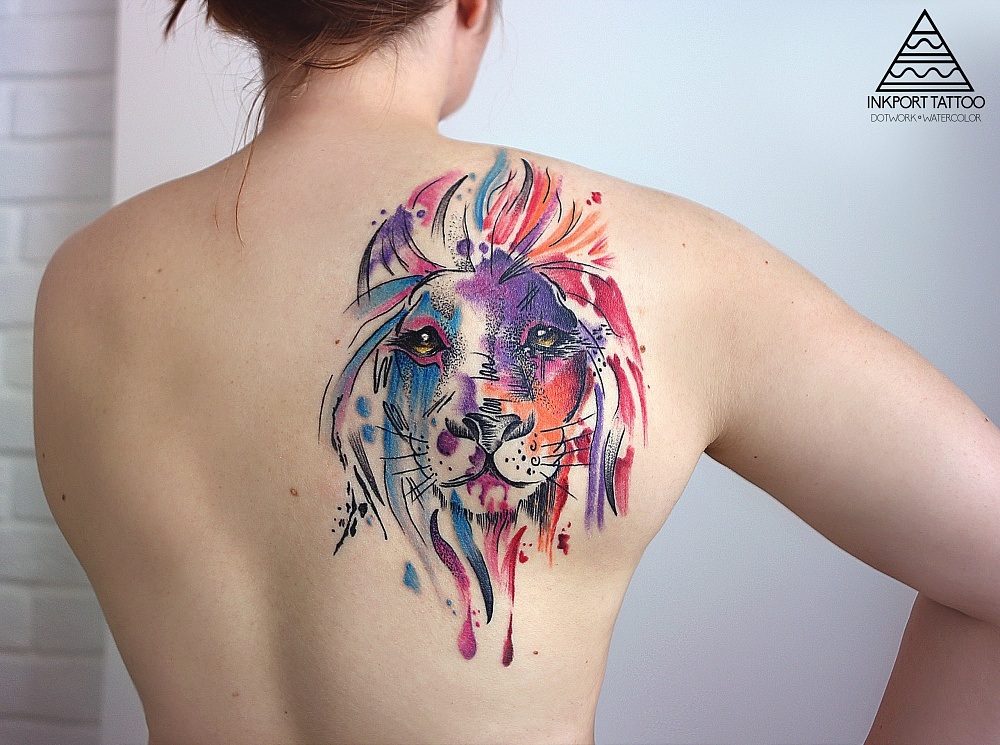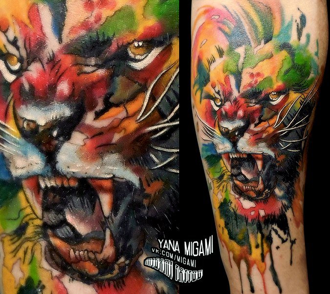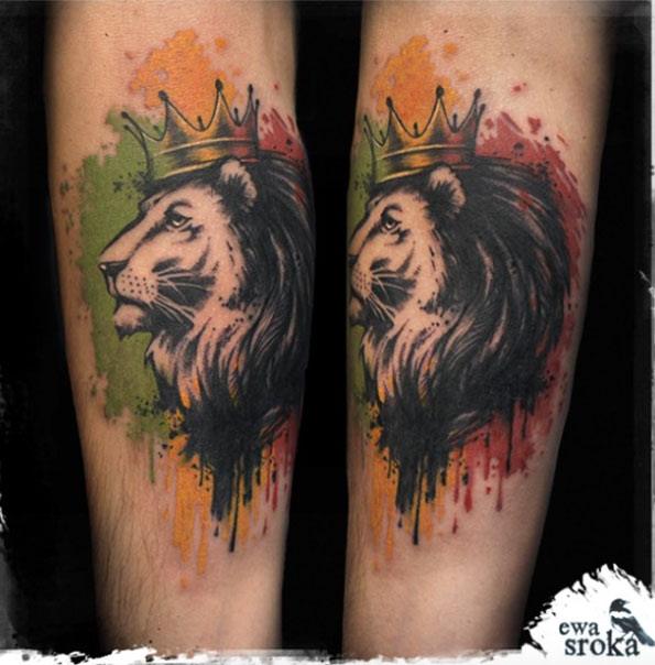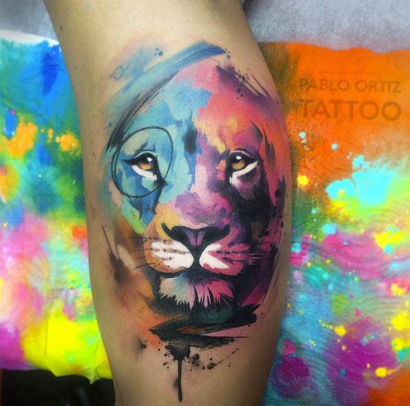 Très souvent, les gens modernes peuvent voir un tatouage coloré avec un lion, réalisé à l'aquarelle. Ce style est préféré par les personnalités purement individuelles et dynamiques. Mais le tatouage de couleur avec le roi du monde animal, réalisé dans un format de bande dessinée, semble particulièrement extravagant. Il est de coutume de remplir les tatouages géométriques avec de l'encre noire, mais un lion coloré de plusieurs lignes a l'air beaucoup plus spectaculaire.