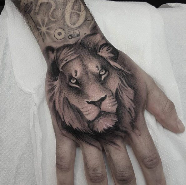 Superbe photo examen d'un tatouage de lion