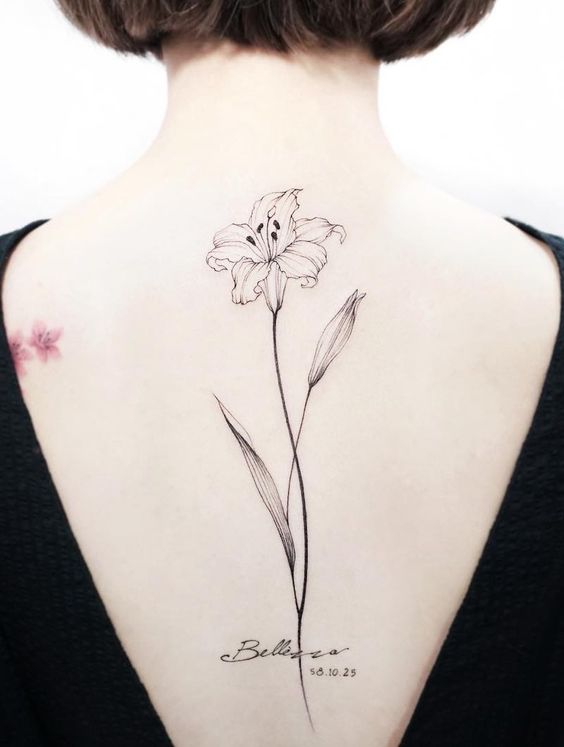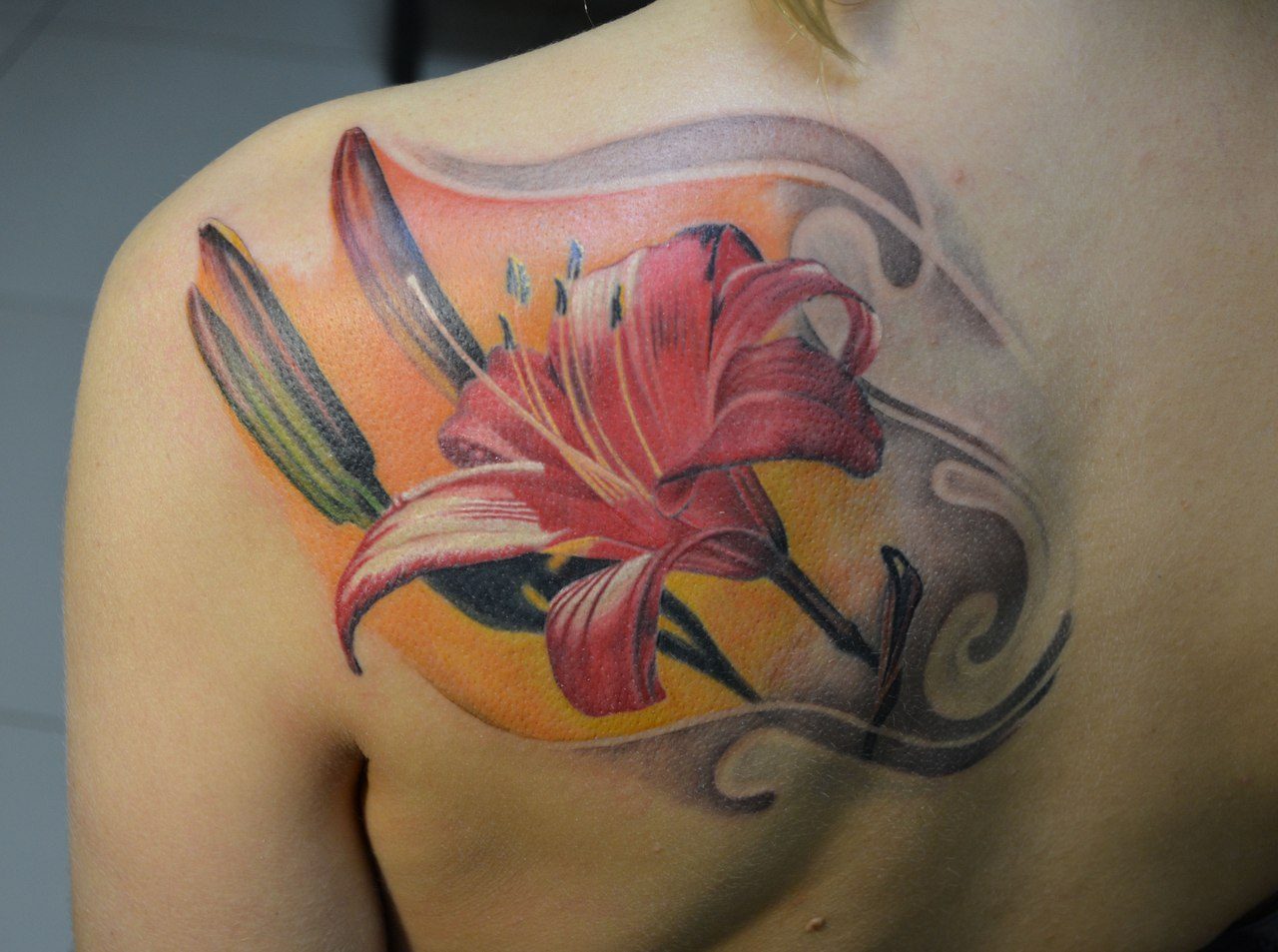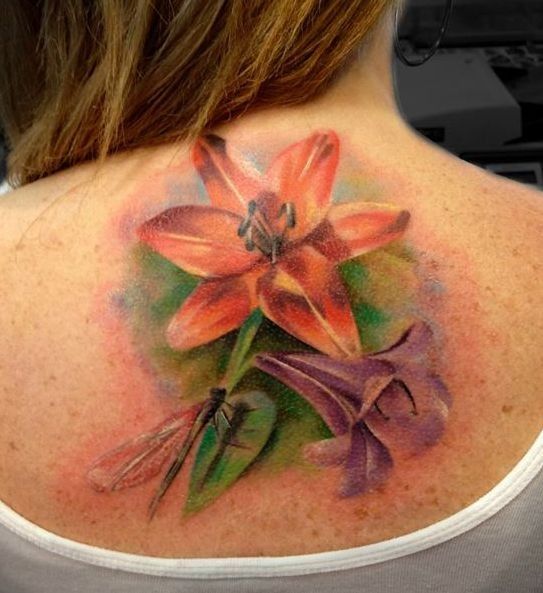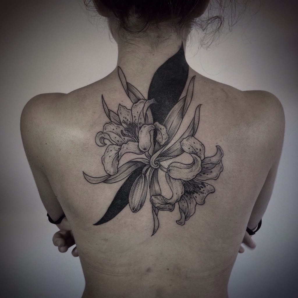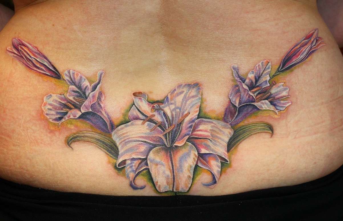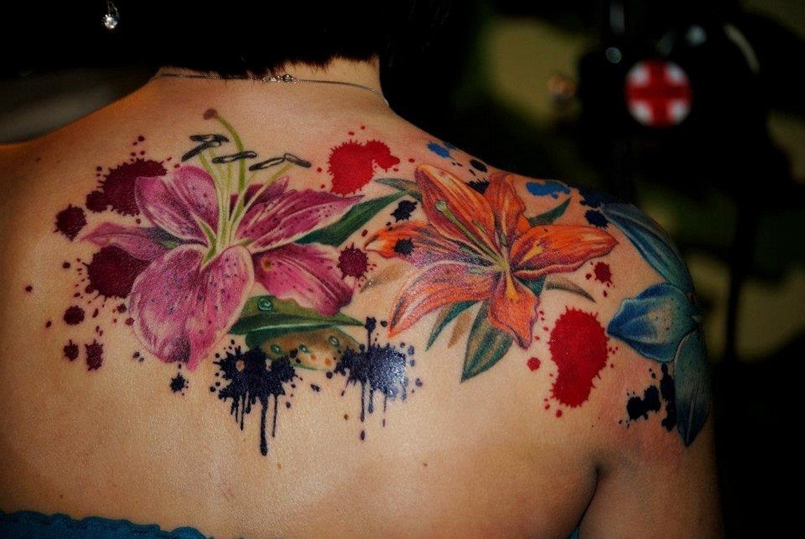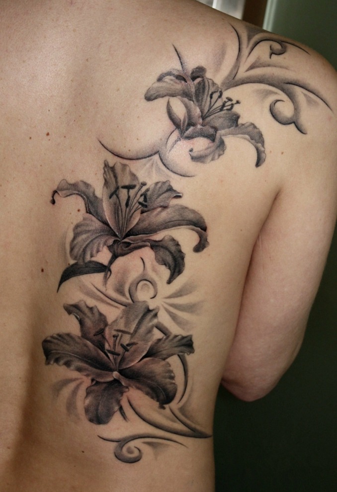 Le noble lis jaune sur le dos parle surtout de l'inaccessibilité, de la fierté incroyable et de l'arrogance de sa maîtresse. Un tatouage de cette couleur est conseillé pour les femmes plus matures qui ont trouvé leur place dans la vie et comprennent qui elles sont vraiment. Un lys blanc soigné sur le dos, entouré d’épis acérés et de nombreuses mauvaises herbes, parle d’innocence et de pureté, par rapport au monde cruel et vicieux qui l’entoure. Lilas lis exprime la modestie et la timidité d'une fille. Si vous voulez simplement dire cela avec votre tatouage, vous ne devez pas compléter la fleur avec d’autres éléments. En général, une fleur dans n'importe quelle nuance sur le dos évoque des pensées sur la chasteté, l'innocence et la fragilité de son propriétaire.