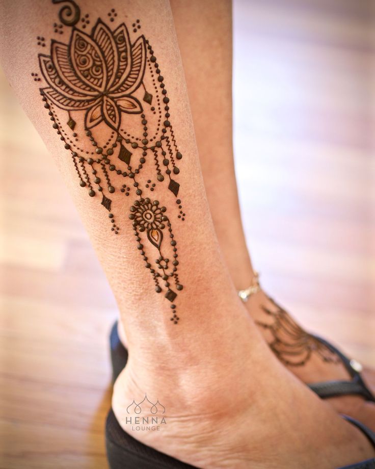 Pour ceux qui veulent décorer temporairement leur corps avec une fleur de lotus envoûtante, vous pouvez utiliser le henné. Un tel tatouage est absolument sans danger et sans danger. L'image s'efface avec le temps, mais vous pouvez dessiner l'image autant de fois que vous le souhaitez. Un tel tatouage temporaire peut durer d'une semaine à un mois, en fonction des soins apportés au tatouage, des propriétés de la peau et, bien entendu, de la qualité de la peinture. Les tatouages temporaires peuvent également être réalisés avec des encres chimiques et biologiques. Un lotus à base de henné aura l’air naturel. Vous pouvez sentir la beauté et la puissance de ce symbole, même temporairement.