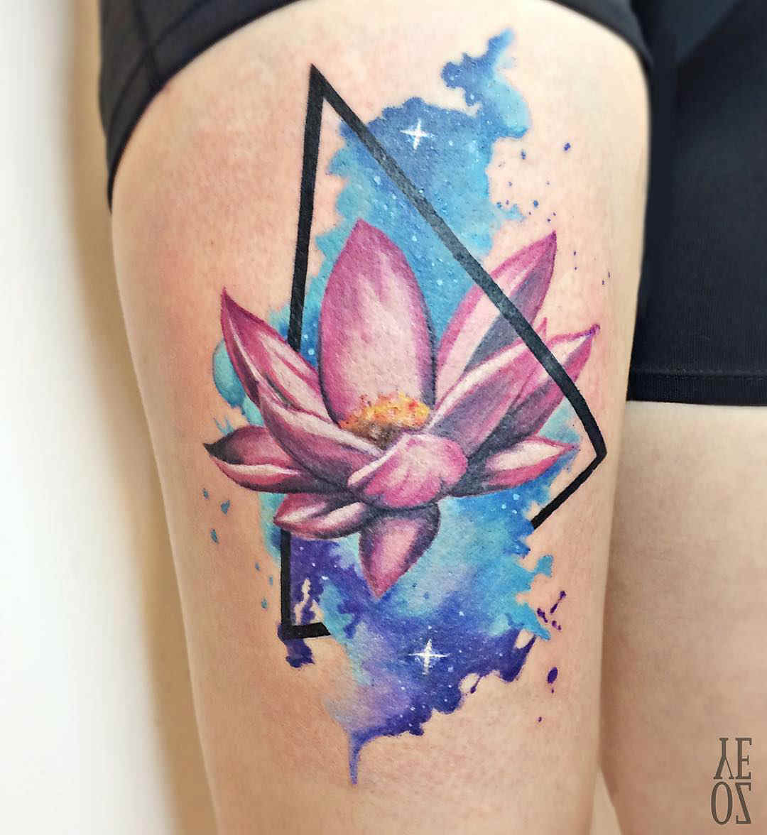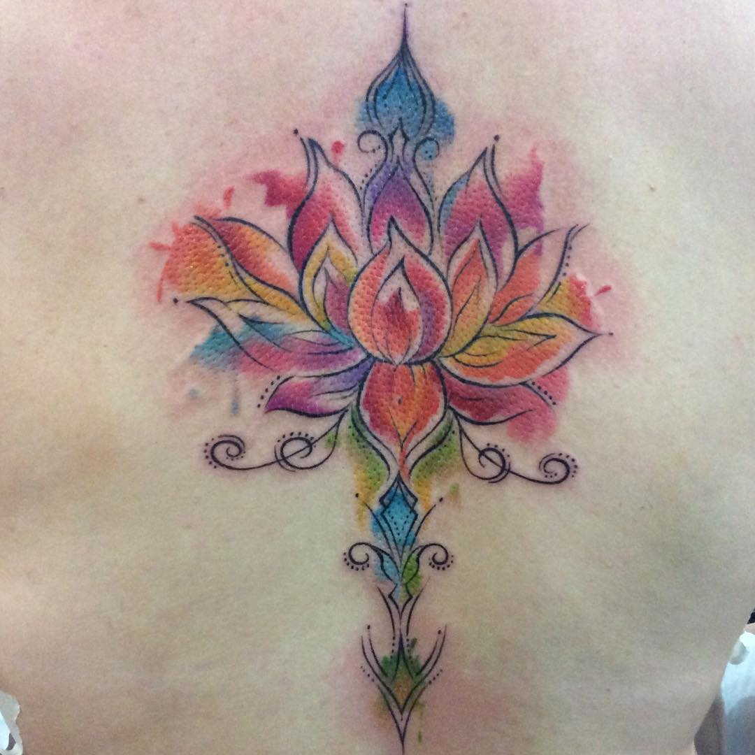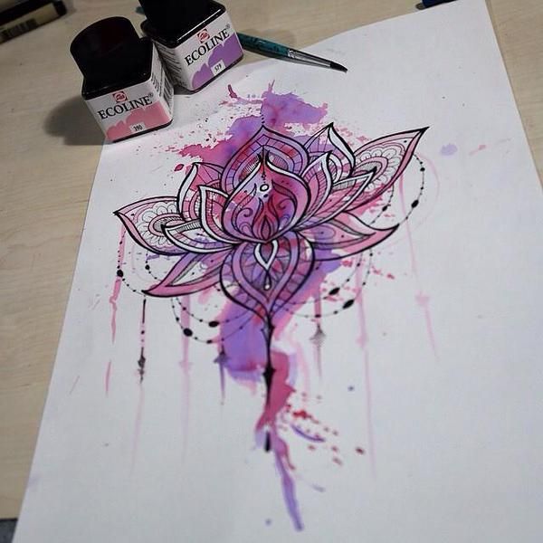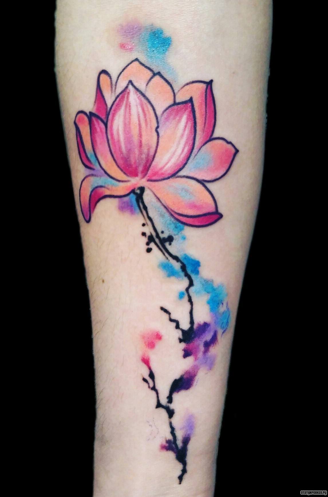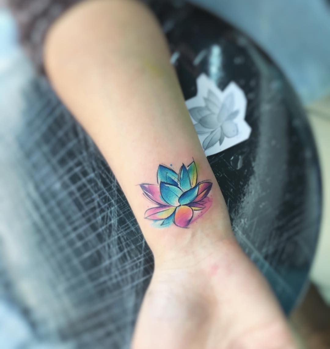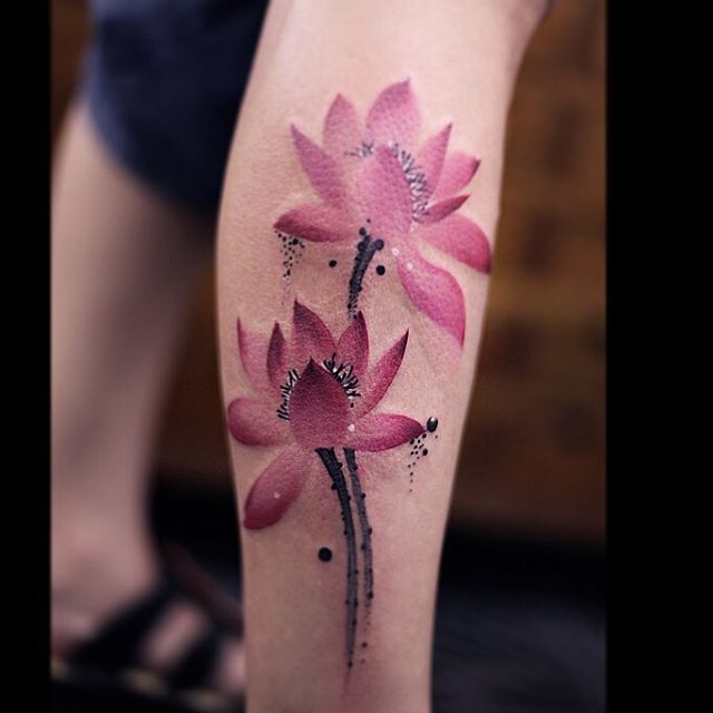 Le plus souvent, les dessins du corps d'un lotus coloré sont réalisés par des représentants des pays de l'Inde ou de la Chine. Ils sont plus réalistes et fabriqués dans un style psychédélique. Aujourd'hui, les tatouages aquatiques sont populaires. Cette vue vous permet de représenter un dessin, certes pas très réaliste, mais très beau et délicat. Le seul inconvénient des tatouages en aqua est le coût élevé d'une peinture de haute qualité, mais pour créer un excellent tatouage, vous ne devez pas épargner de l'argent. Sinon, le dessin à l'aquarelle perdra son expressivité et l'image sera tout simplement «perdue».