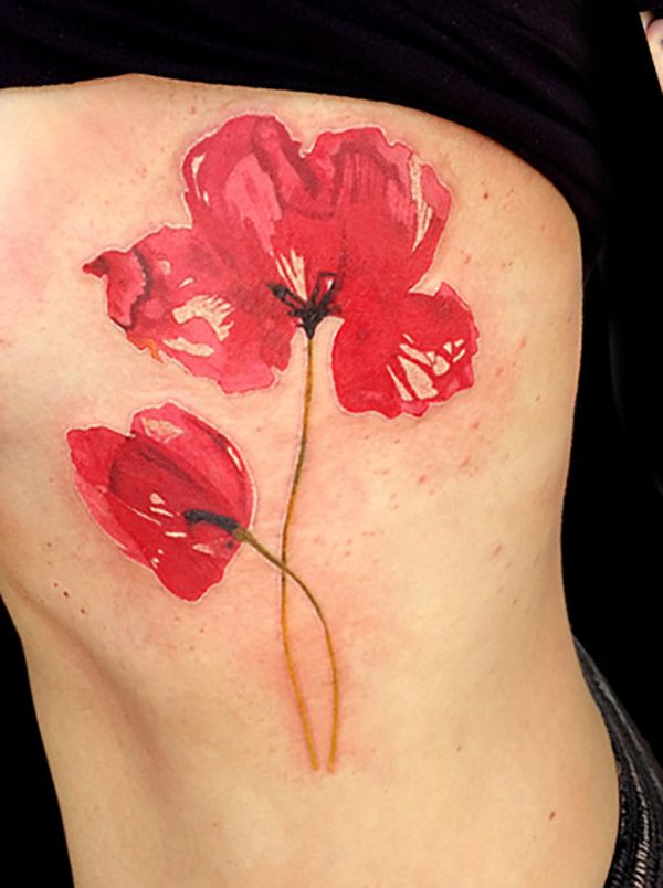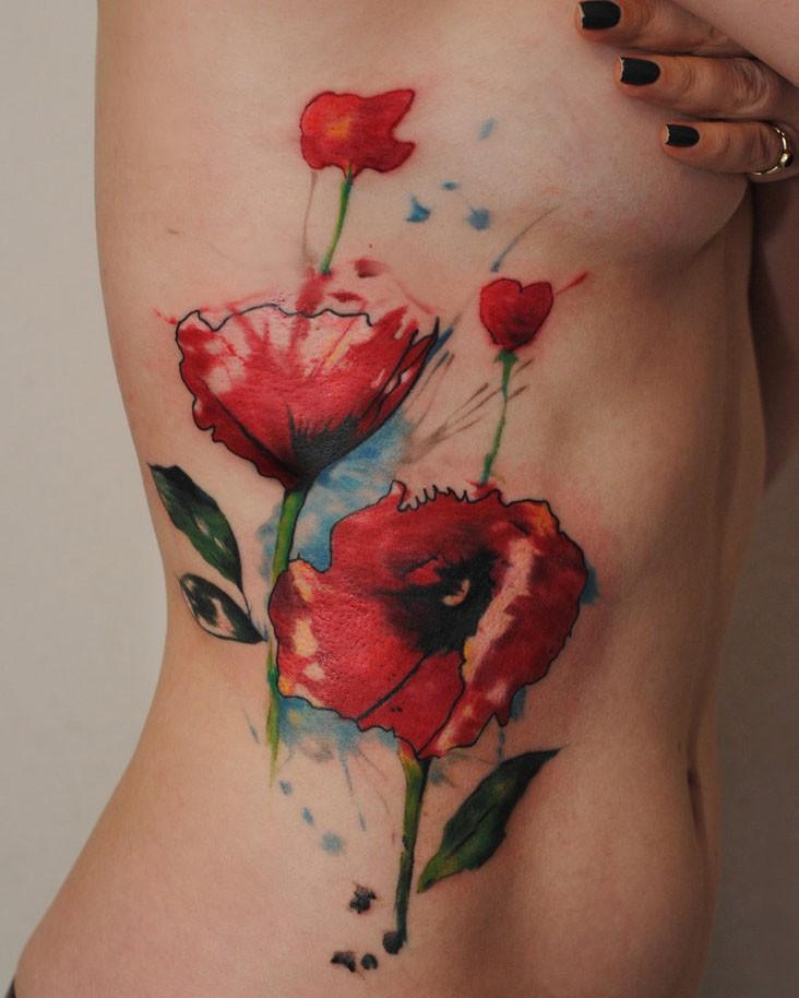 Bien sûr, pour le coquelicot, la couleur caractéristique est le rouge (moins souvent le blanc et le jaune), mais vous pouvez également trouver des fleurs noires et blanches. Les coquelicots d'aquarelle sur le corps sont incroyables. Pour compléter la photo, vous pouvez ajouter des feuilles et des tiges vertes. Il est très rare de trouver des tatouages avec des coquelicots dans d'autres couleurs. Le symbolisme du tatouage peut varier légèrement en fonction de sa nuance. Les coquelicots rouges brillants transportent l'amour et la romance.