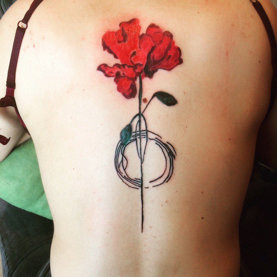 Pour créer un croquis, les spécialistes utilisent souvent la technique du goutte-à-goutte. C’est alors que votre image coule légèrement avec de la peinture, ce qui ajoute à l’image de crédibilité et d’unicité. Un croquis de coquelicot avec de nombreux animaux sera très beau. Par exemple, une coccinelle complétera votre fleur et lui donnera un zeste qui ajoutera du sens au renouveau de la nature. Si vous voulez vous démarquer par son originalité, ce sera pour vous une excellente option pour l'image d'un coquelicot qui se développe à travers vous. Il peut être représenté sur les côtes, commençant à pousser à gauche, et le capitule lui-même se terminant à droite. Un tel tatouage sur la hanche ou le bras aura également fière allure.