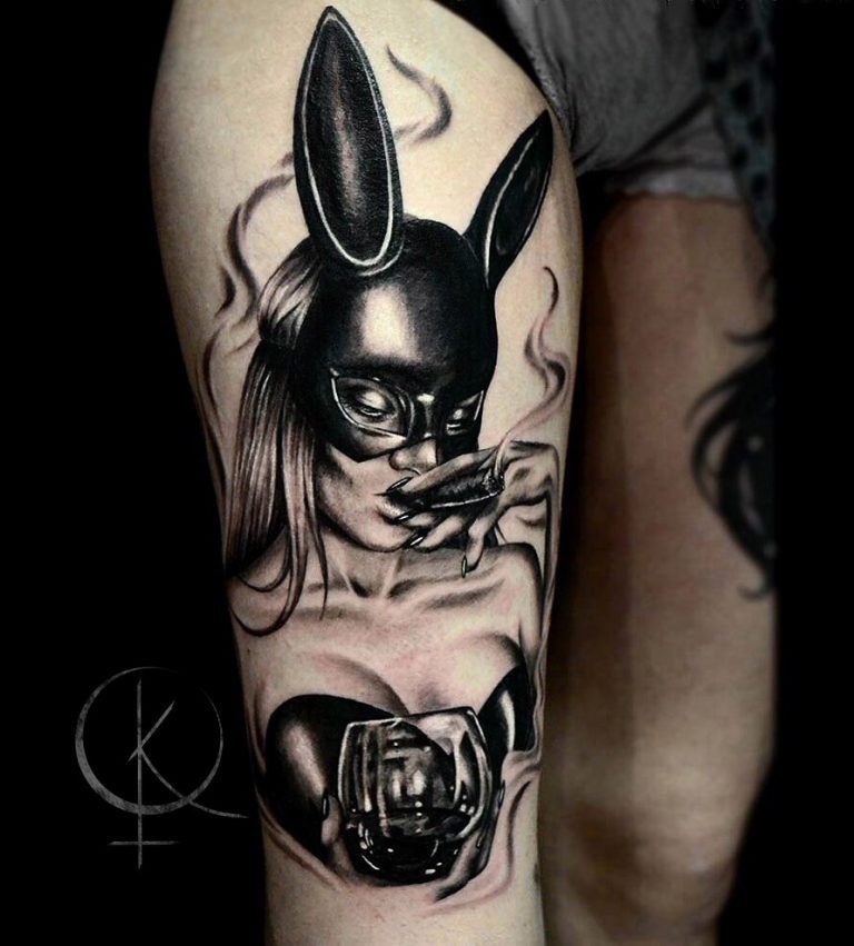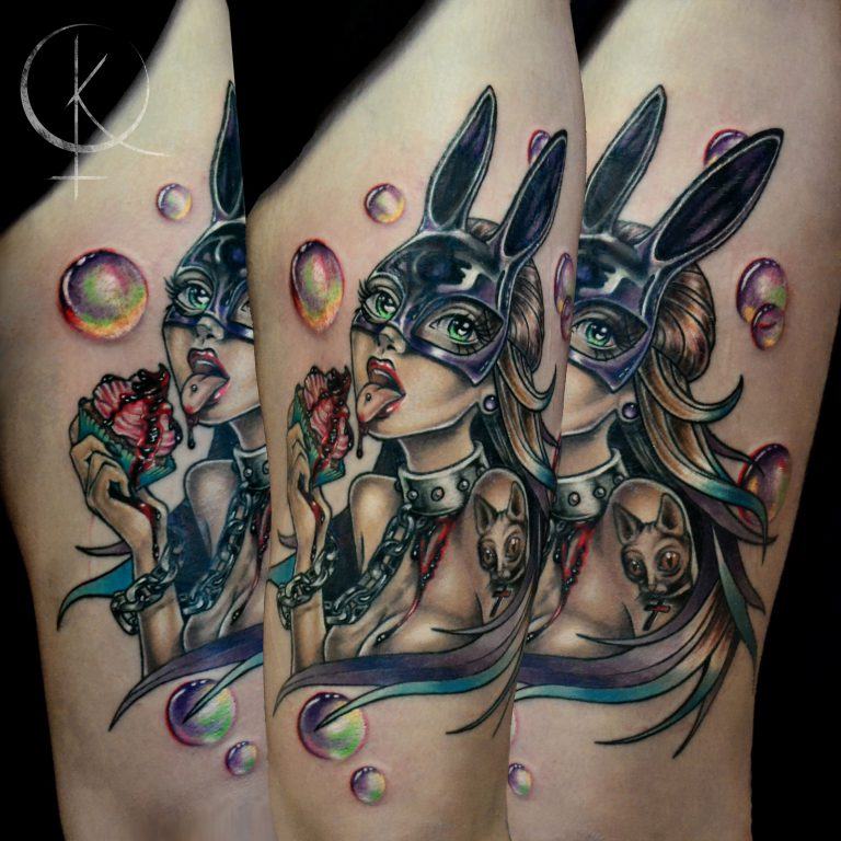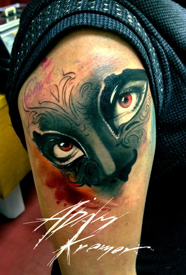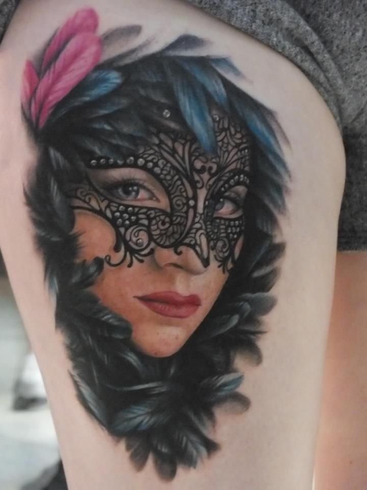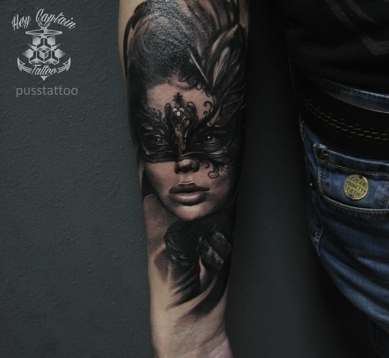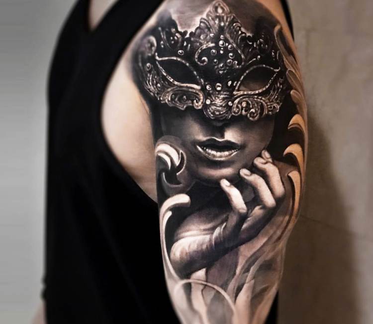 L'image de la jeune fille au masque, représentée sur le corps, a un symbole de double nature, un décalage de l'état interne avec ce que les autres voient. Un beau tatouage lumineux peut facilement décorer le corps masculin et féminin. Un tel tatouage semble très attrayant. La combinaison de la beauté féminine et de la luminosité du masque crée une image charmante.