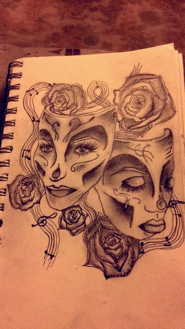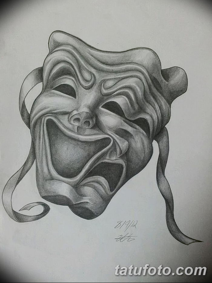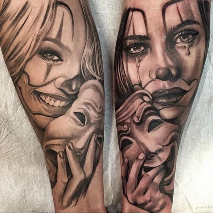 Un tatouage avec l'image d'un masque triste ou en pleurs est appliqué par des personnes qui veulent montrer qu'elles ne sont pas comme les autres les voient. Ces tatouages peuvent être choisis par les hommes et les femmes. Mais le plus souvent, le tatouage d’un masque triste est associé à un masque joyeux, mais en même temps, il ne perd pas sa signification.