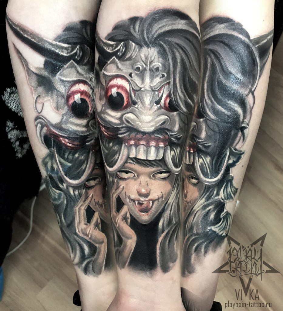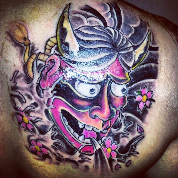 Dans la mythologie japonaise, La Canée est un démon. Mais dans la culture japonaise, les démons ne sont pas des personnages entièrement négatifs. Ce sont très probablement des parfums qui protègent et préservent. L'image du masque de Chania est un tatouage très coloré, exceptionnel, attrayant et accrocheur. La Canée a des cornes, un sourire pincé et un regard agressif. Un tel tatouage est toujours représenté en couleurs vives, et la version noire est rare. Appliquez un tatouage principalement sur l'avant-bras ou le bras.
